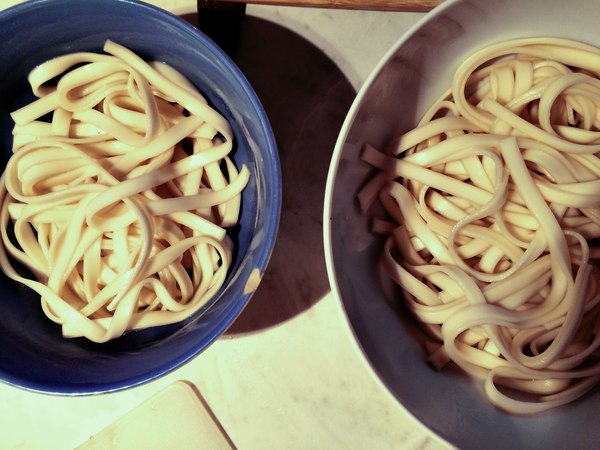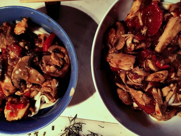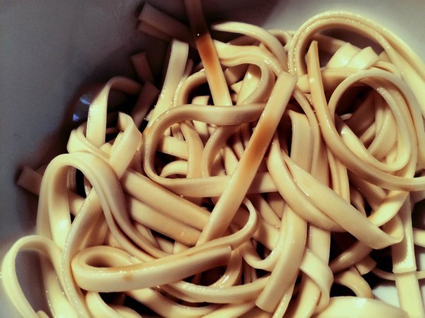 Лапшу удон я беру покупную, самому раскатывать и нарезать как-то никак не хватает ни сил ни желания, хотя надо бы, с домашней блюдо становится раз в 10 вкуснее, но и покупную можно подобрать такую, что не стыдно гостей угощать. Главное, следите чтобы она быша достаточно широкой, а то повадились нынче продавать тонкую как не пойми что...
