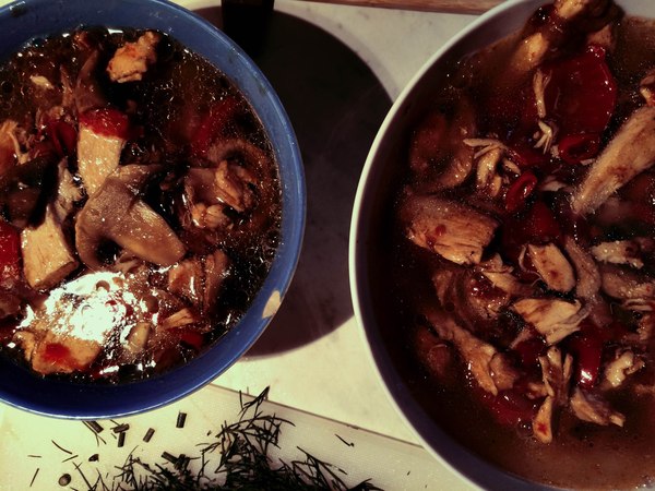 Если вам по тем или иным причинам не хочется есть мясо, то варите овощной бульон, главное, чтобы он не был солёным (кисло-сладкий и соевый соусы и так добавят необходимое количество соли), многие любят добавлять обжаренный тофу на манер мисо супа, но тут зависит от вашего личного отношения к данному лакомству.