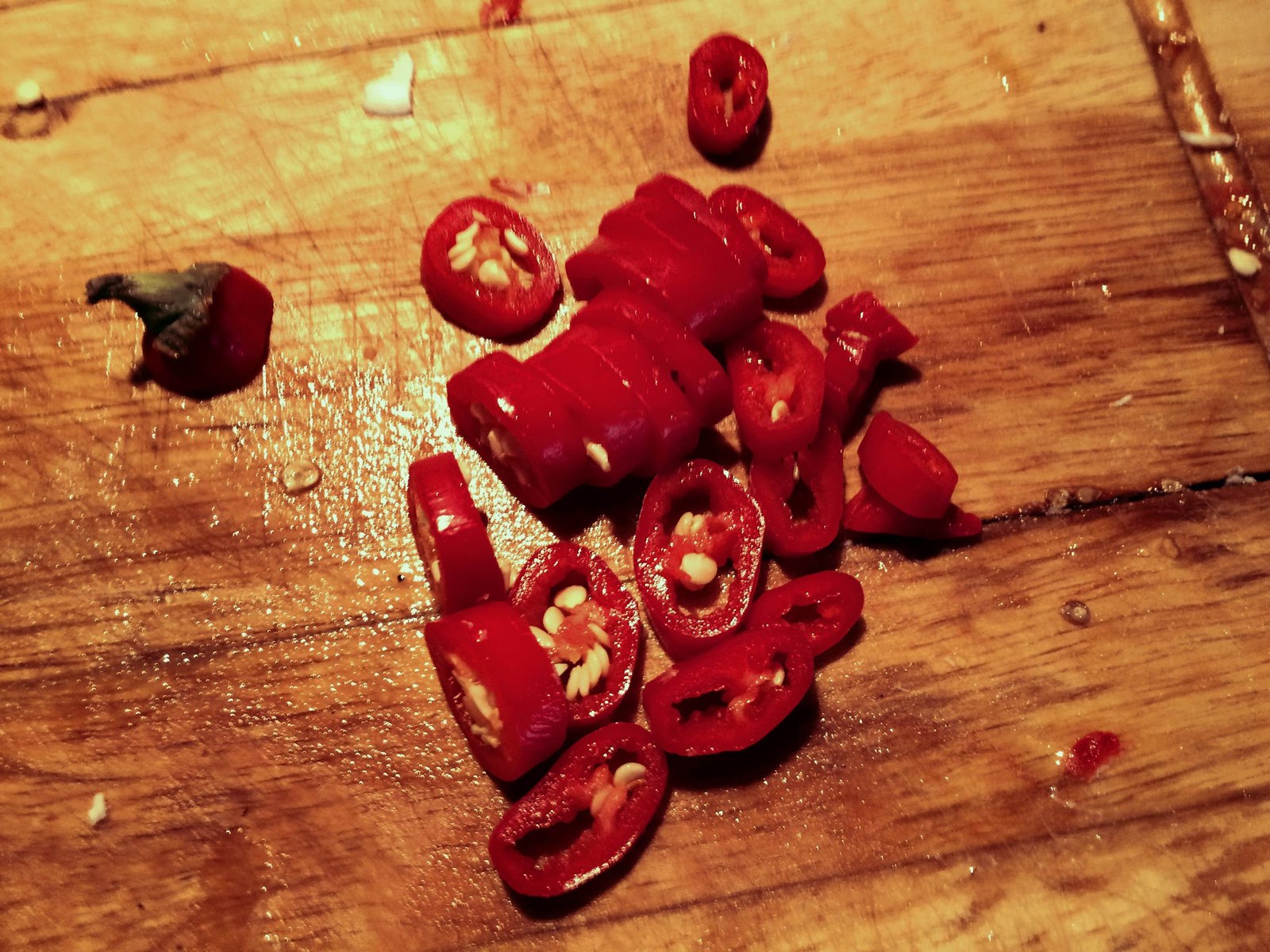 Немного подтушив лук мы добавляем мясо и накрываем всё это дело крышкой на средний огонь (не забываем помешивать, чтобы ничего не пригорело), сами пока разбираемся с грибами и острым перцем. Их добавляют одновременно через 7-10 минут от начала тушения. Обжарка перемешивается и оставляется ещё минут на 5 на среднем огне с закрытой крышкой.
