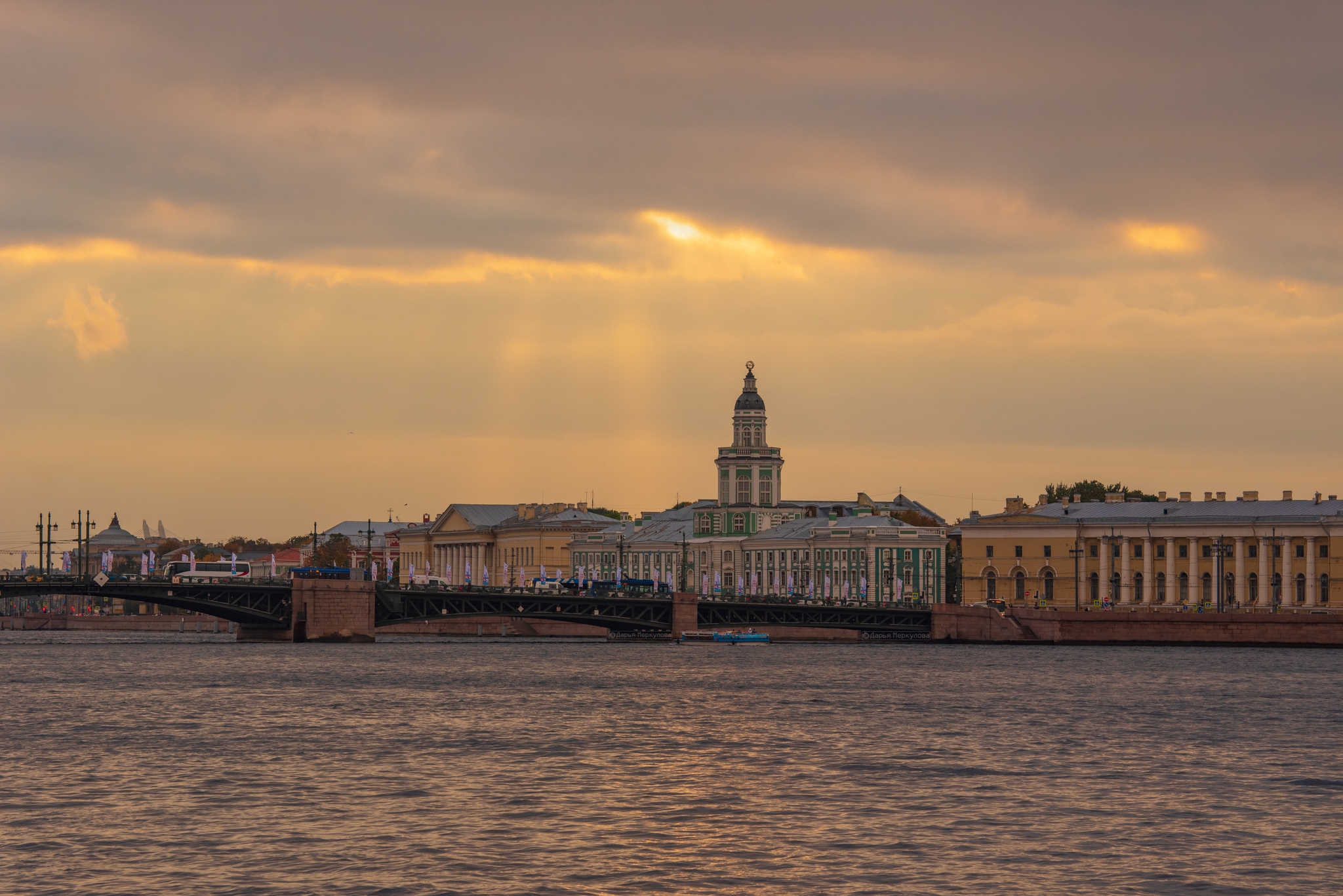 На первой фотографии: река Нева, Дворцовый мост; слева за мостом - пилоны моста ЗСД и главка Церкви Успения Пресвятой Богородицы; правее - главка Храма Св. великомученицы Екатерины в здании Российской Академии художеств (РАХ), самое высокое сооружение на фото - здание Музея антропологии и этнографии Академии наук (МАЭ, или Кунсткамера), левее Кунсткамеры - здание РАН, правее - Зоологический музей