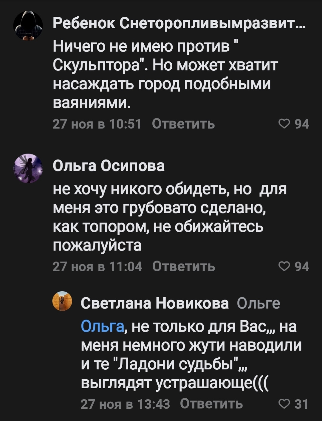 Жителям Челябинской области по каким-то причинам не понравился памятник «Семья солдата СВО», который подарил городу скульптор Александр Тимофеев. «По итогам опроса большинство жителей Троицка высказались против установки», — заявили в местной мэрии.
