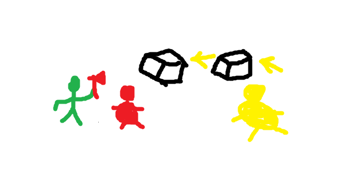 Попробуйте ставить бюреров в одну линию,чтобы между очередным бюрером(желтое пятно) и ГГ (зеленое пятно) был как минимум 1 бюрер (красное пятно), тогда все ящики полетят в того, кого вы будете резать.