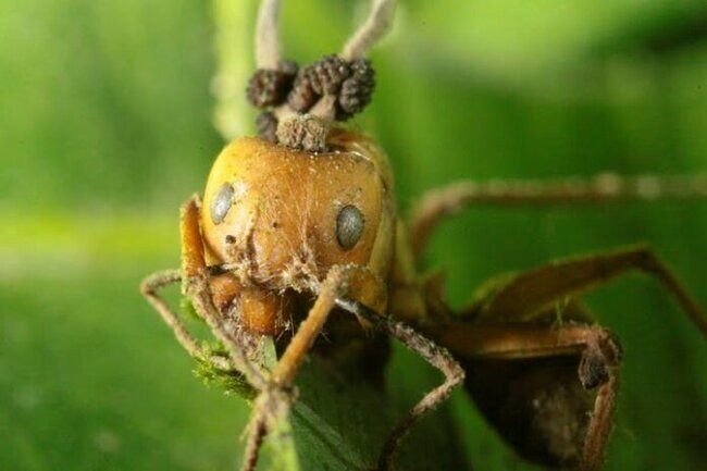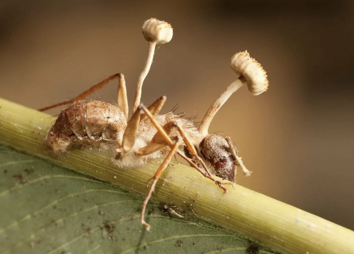 Гриб-паразит кордицепс однобокий - страшный бич тропических муравьёв-древоточцев. Когда его спора попадает в муравья, она прорастает грибницей. Грибница "съедает" пищеварительную систему и мышцы насекомого, но нервную систему не трогает... только начинает изменять поведение. Муравей, проросший этим грибом, превращается в зомби.