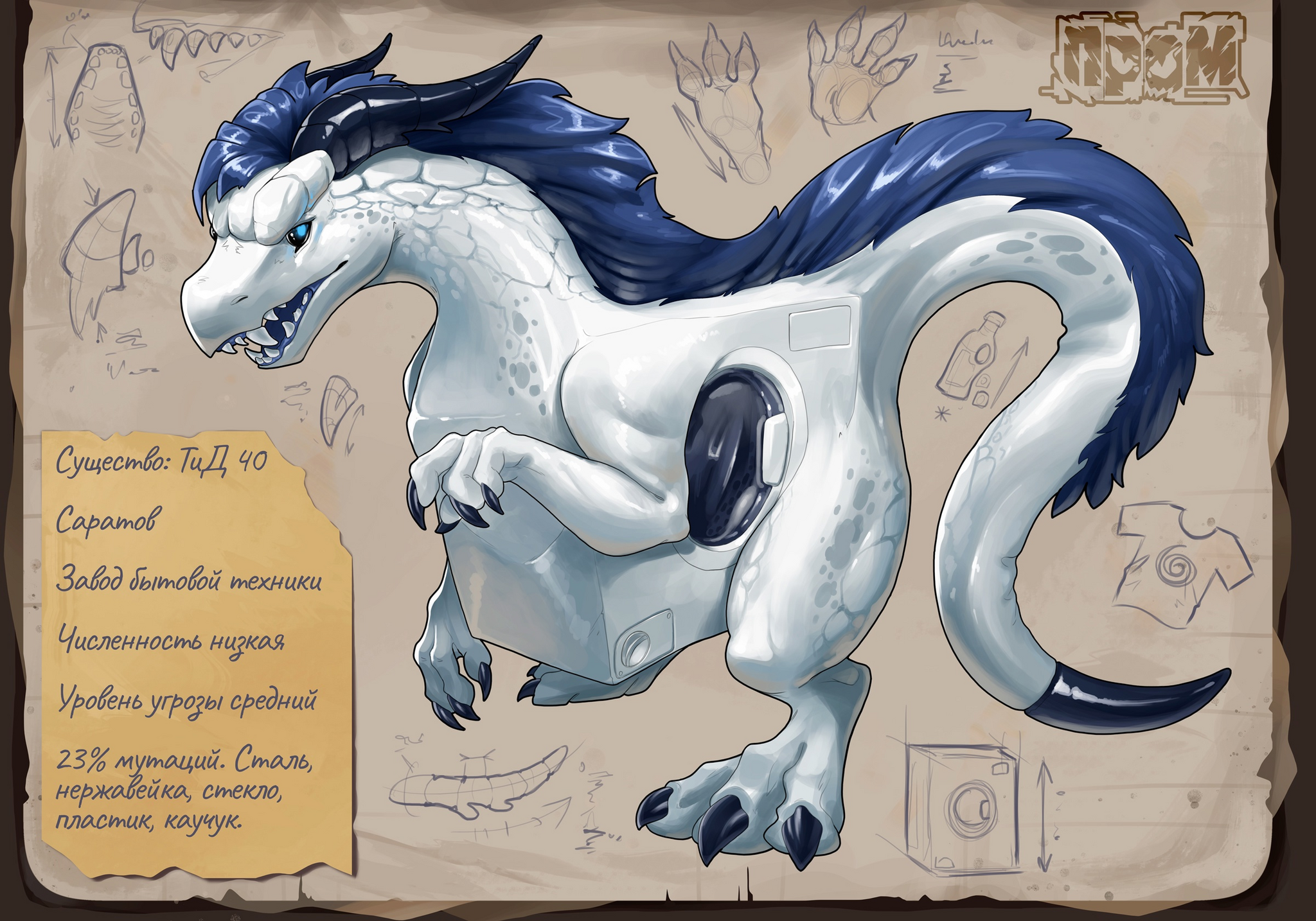 Комментарий исследователя: "Да, Тид 40 нам хорошо известен, хотя мы начинали его изучение, еще когда не состояли в рядах сотрудников НИИ ТОС. Массивное тело, крупные зубы, грива из какой-то резины, будто это коврик для ванной. Он сильно нас испугал в нашу первую встречу. А сейчас мы часто их навещаем. Существо даёт полезные ресурсы, в виде порошка, который, после стирки, укрепляет ткани, делая их похожими на кевлар. А Семён постоянно пытается закинуть в стиралку этого существа свои носки"
