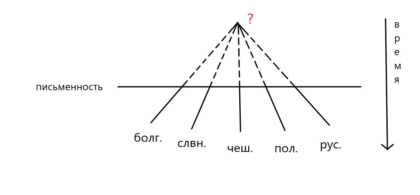 Таким образом, если представить историю славянских языков в виде линий, то чем дальше в прошлое, тем ближе эти линии будут друг к другу. Смело можно предположить, что и для дописьменной эпохи тенденция будет той же. В таком случае рано или поздно эти линии пересекутся в одной точке. Примерно так: