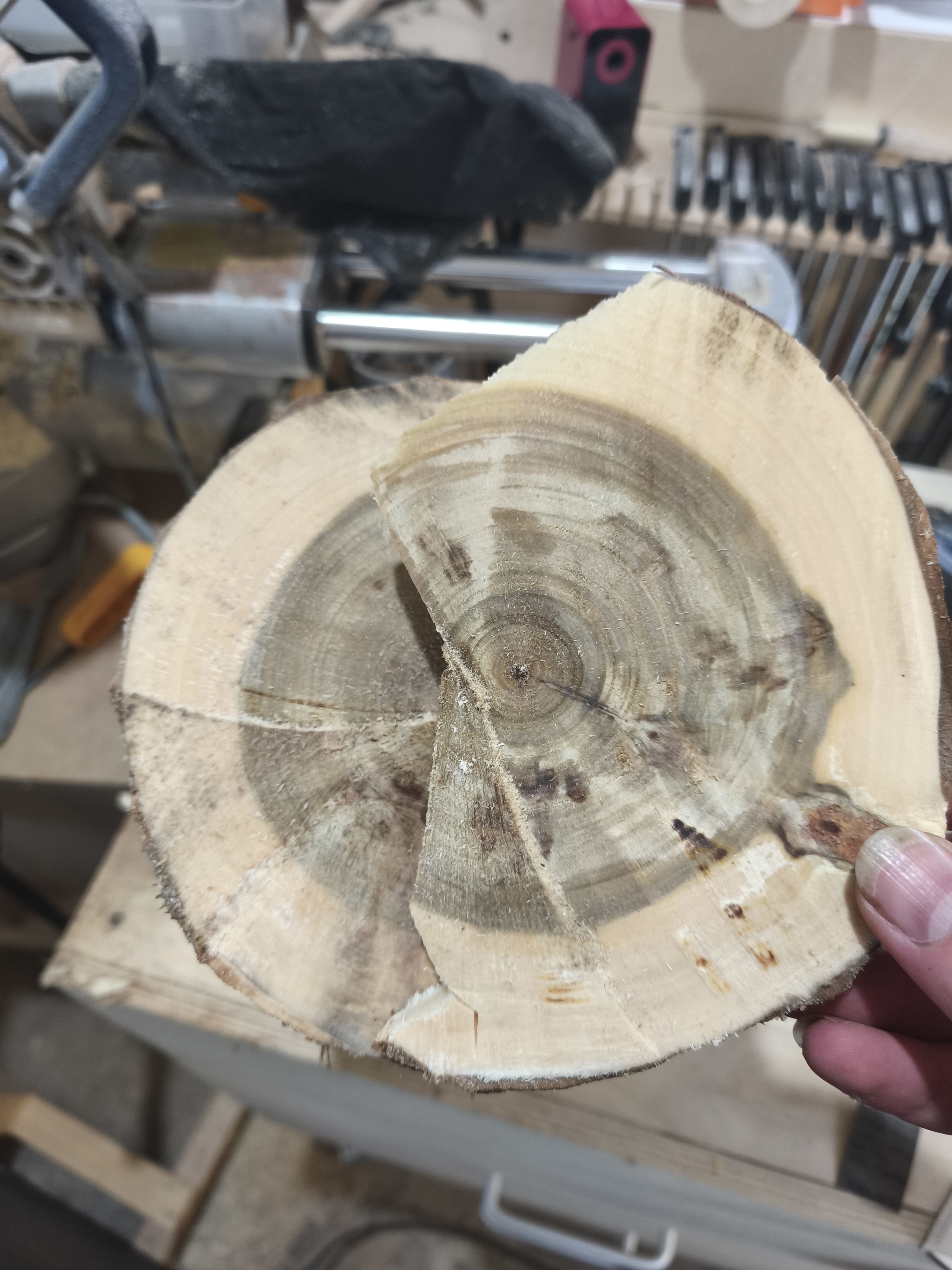 Древесина осины, в целом, не особо котируется ввиду своих ттх, она подвержена гниению, имеет множество сучков и проч. Но, на безрыбье, как говорится, и рак рыба. К тому же нужно было что-то, что не жалко. Но она таки сумела меня удивить. От одного бревна я отрезал не влезающий в кастрюльку кусок и мне открылся весьма приятный взору болотно-зелёный цвет сердцевины. На фоне белоснежного слоя заболони очень ярко, "аппетитно" и насыщенно выглядит.