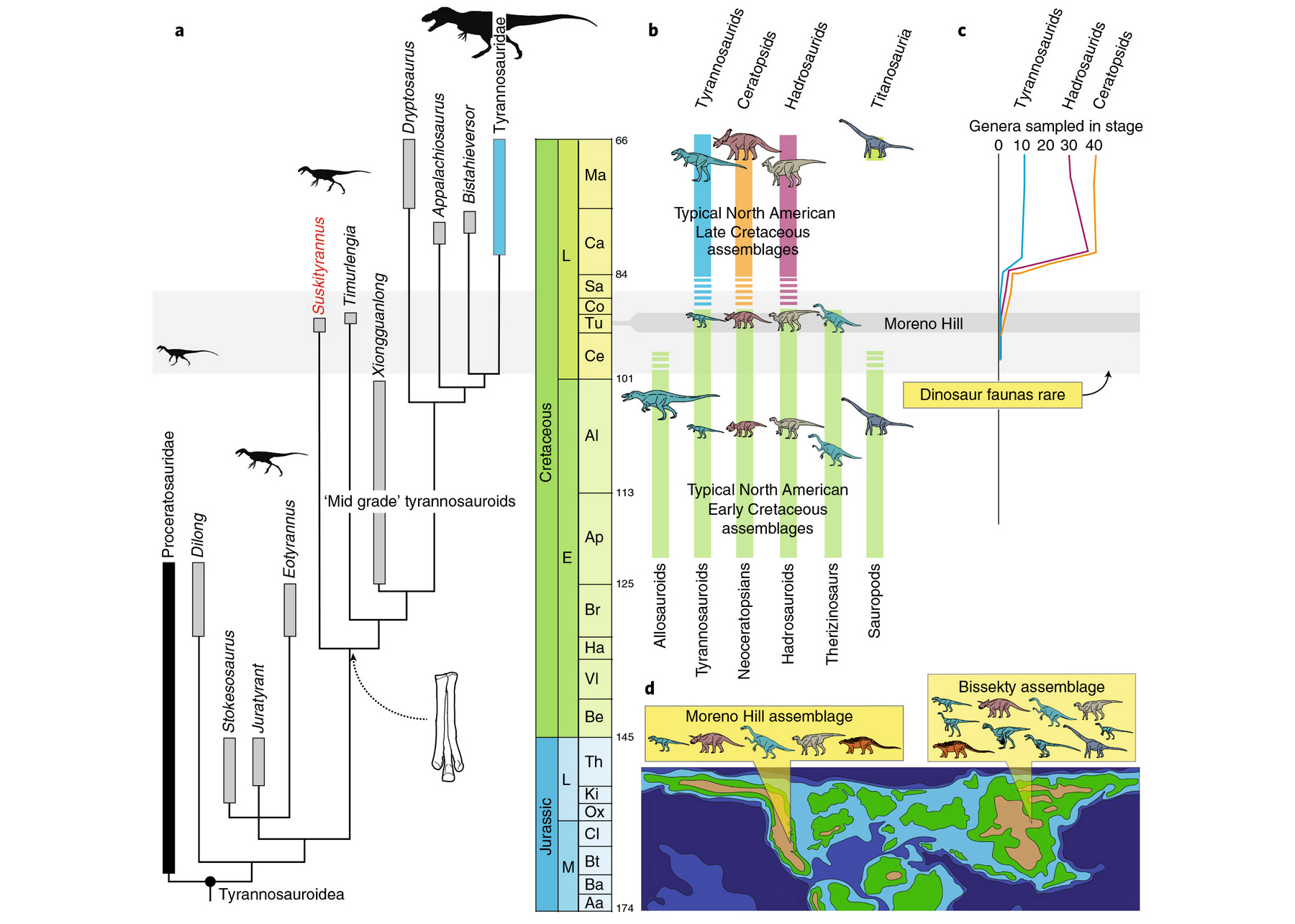 Но хотя размеры сускитиранна скромные, его значение для науки большое. Дело тут вот в чем. Первые родственники тираннозавров — килеск (Kileskus) и эотиранн (Eotyrannus) — появились 166 млн лет назад, а последние (сам тираннозавр рекс) вымерли 66 млн лет назад вместе с остальными нептичьими динозаврами. Так что группа существовала около 100 млн лет. И как раз посередине этого отрезка — со 100 до 80 млн лет назад — белое пятно. Более 100 млн лет назад жили среднеразмерные хищники вроде сюнгуаньлуна (Xiongguanlong), длиной 3–5 метров. Менее 80 млн лет назад жили уже гигантские высшие хищники вроде литронакса (длиной до 7 м), уже принципиально не отличавшиеся от тираннозавра рекса. Но что было в промежутке? К счастью, в последнее время стали попадаться остатки тираннозавроидов и из этого белого пятна.