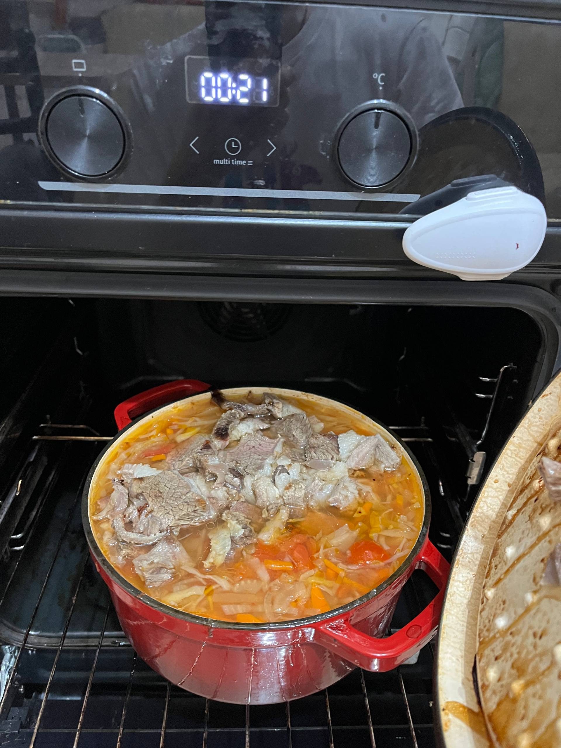 Откладываю его и запускаю все овощи и фрукты. И Все это отправляется на готовится до часу ночи. Нарезал мясо, закинул его в кастрюлю. Тут надо остановится и пояснить, это не суп в том виде, к которому мы привыкли. Это и первое и второе и третье. Бульон здесь, скорее как соус для остального. Около двух ночи я проверил - что все в порядке. Поставил на 120 градусов и ушел спать.
