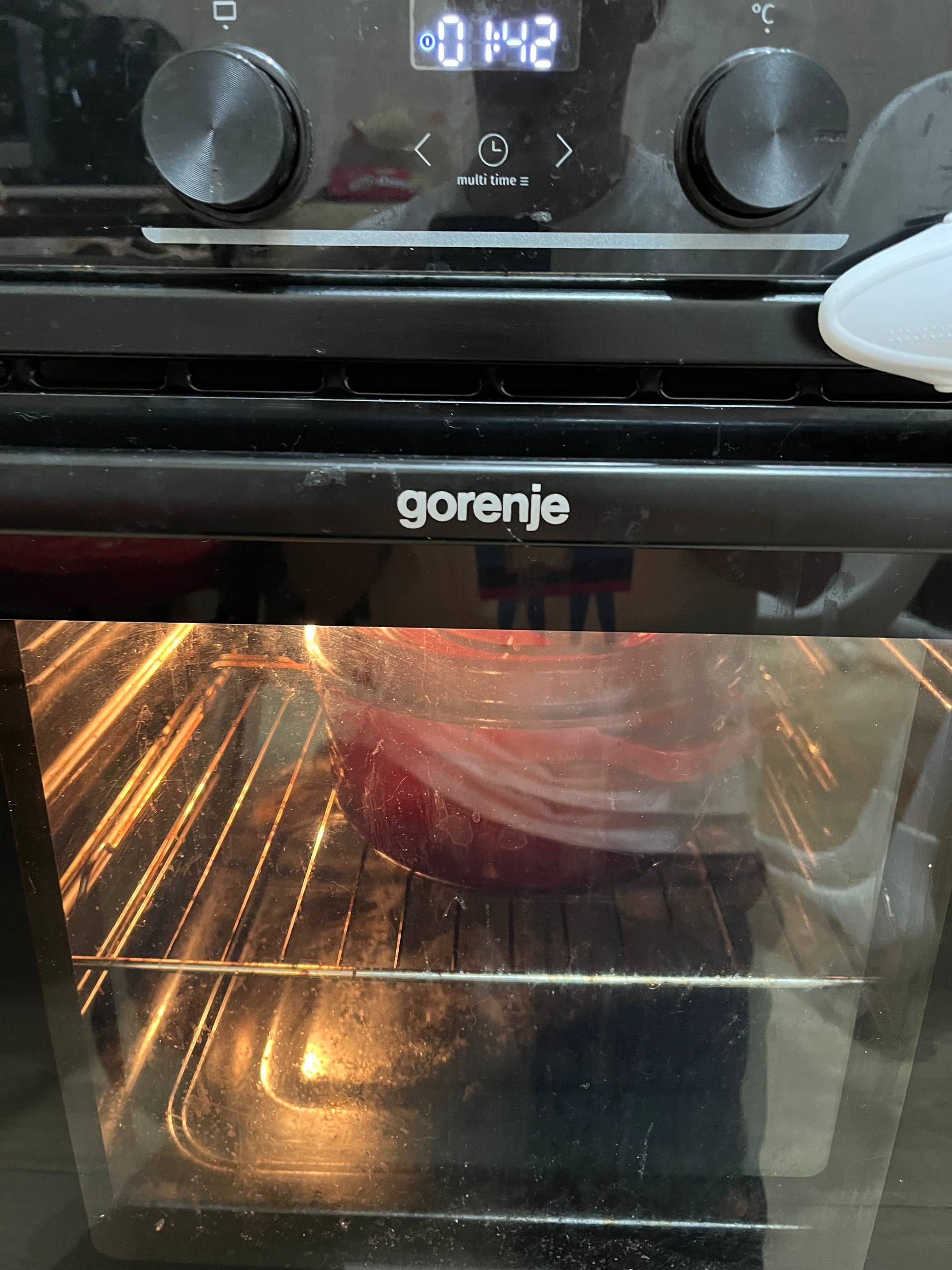 В семь утра, очередная проверка - не убежало ли что, запах на кухне стоял прекрасный. Выключил и оставил доходить, т.к. чугун нагретый, тепло до двух часа дня держал, пока стоял в духовке.
