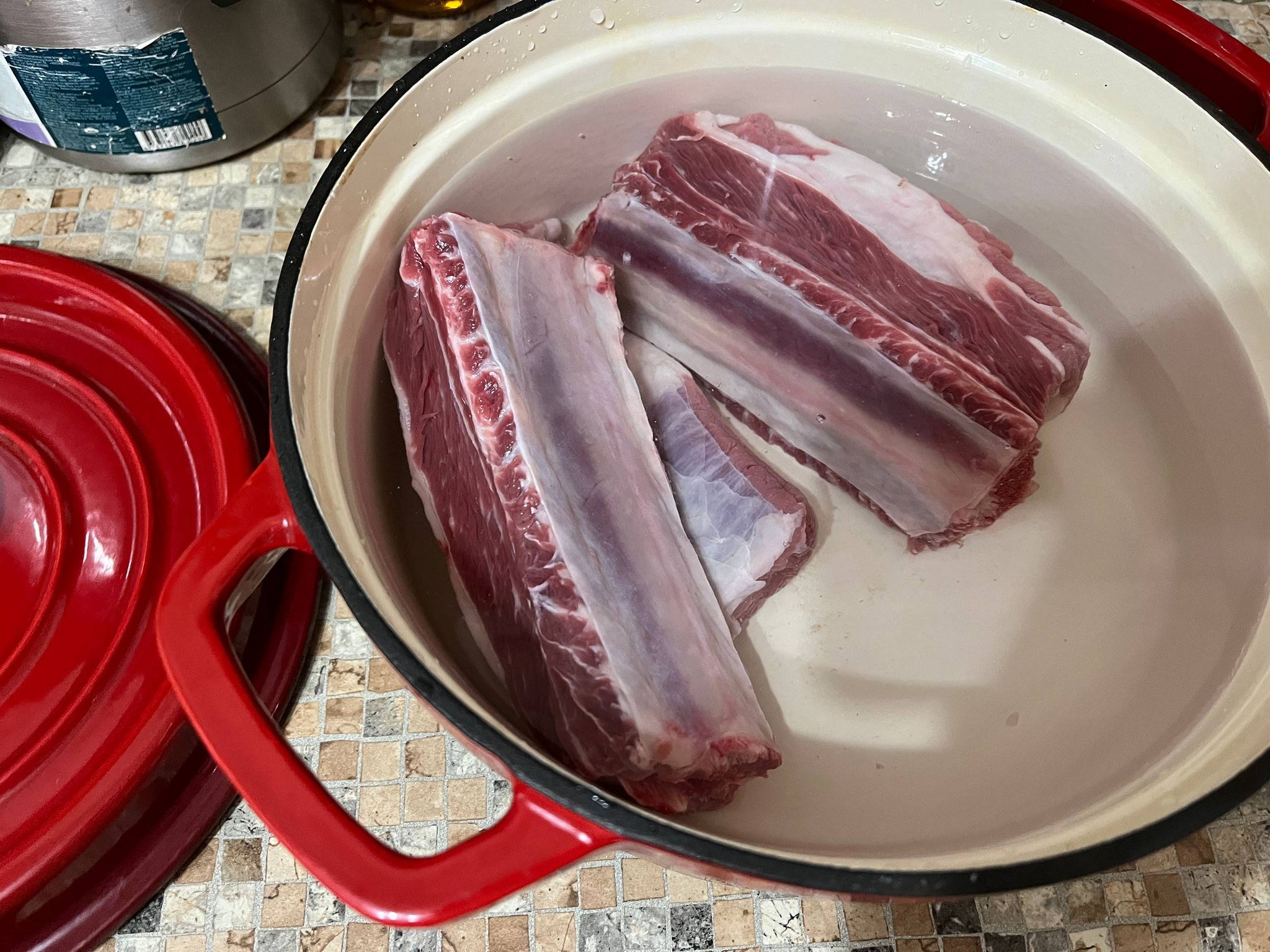 Кастрюля тяжелая, кг пять наверн, эмалированный чугун. Налил воды, положил ребра. Разогрел духовку до 170 градусов, высокая температура нам не нужна, нужно время и равномерный прогрев.