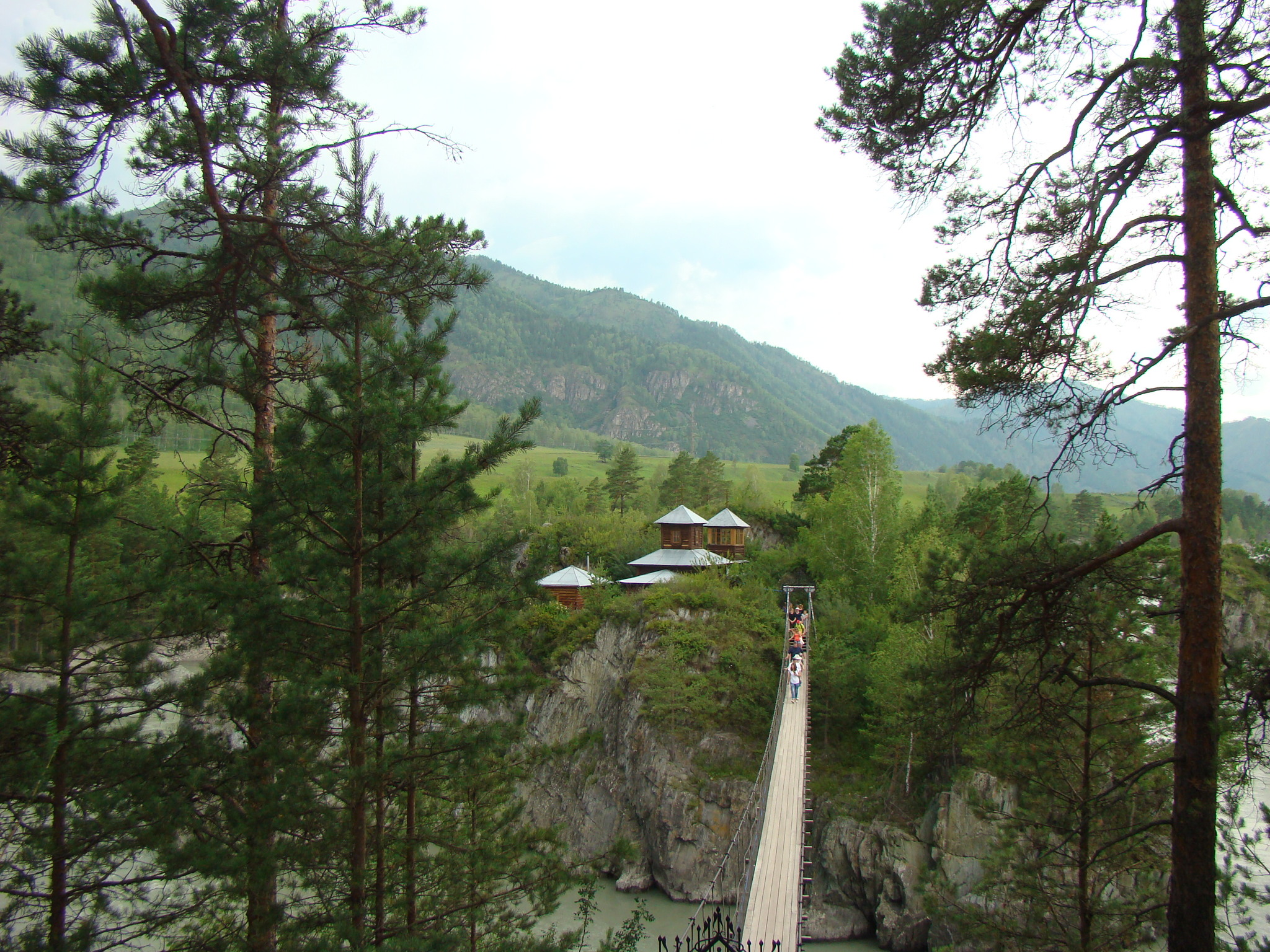 Если со стоянки пойти в другую сторону, то можно попасть на удивительный остров Патмос (51.398507, 86.000313), на котором есть действующий храм. Находится остров посреди реки Катунь, и представляет собой скалу с отвесными стенами. Попасть на остров можно только по подвесному мосту, который выдерживает не больше 6 человек! Из-за этого очередь по обе стороны моста очень большая.