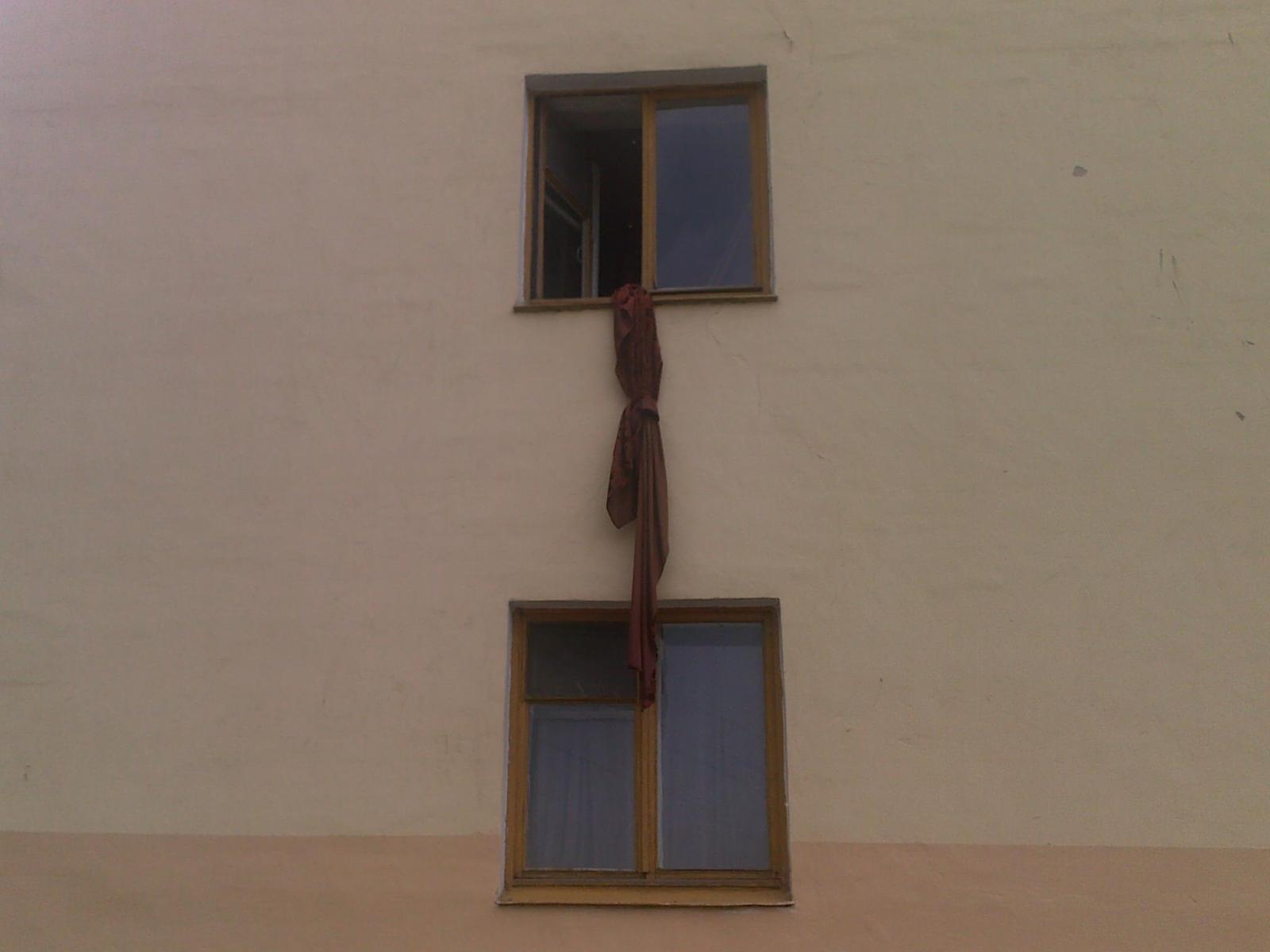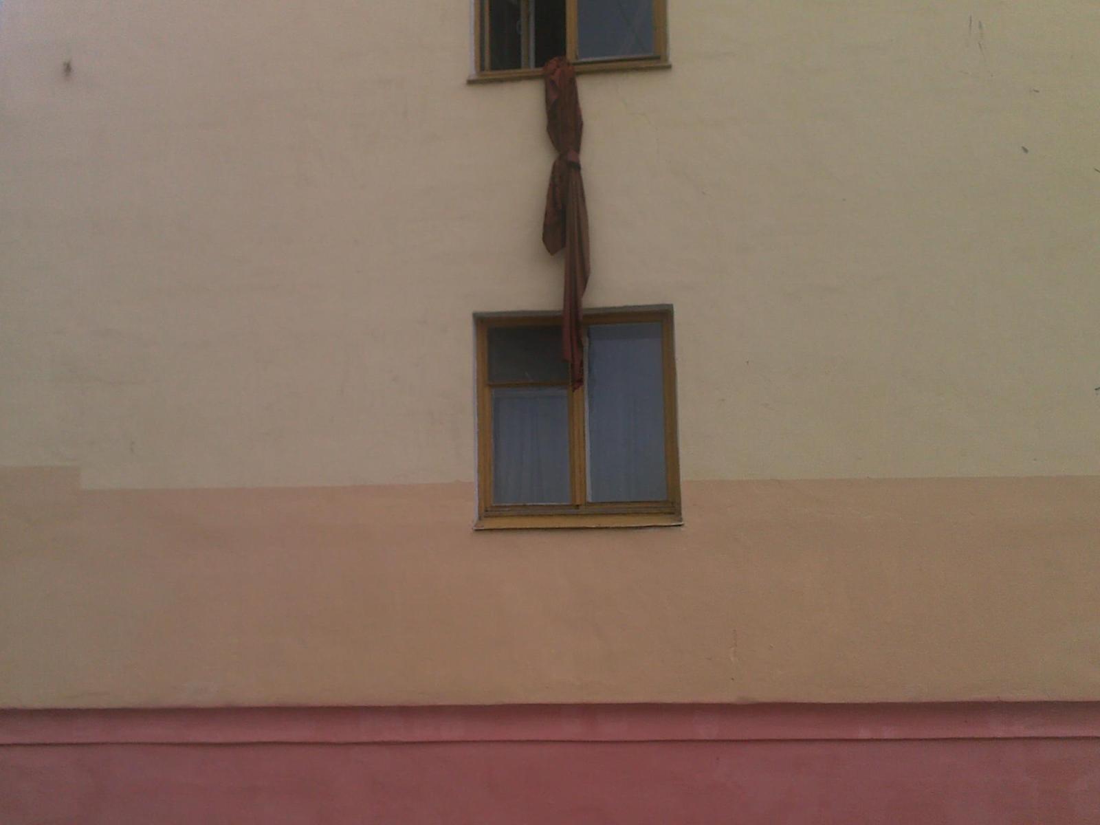 Рассматривал старые фотки и наткнулся на пару фотографий. Обычная пятиэтажка, в квартиру на втором этаже залез вор, но бдительные соседи услышали шум из-за стены и стали звонить в звонок. Ворюга не придумал ничего лучшего, чем спуститься по простыням.
