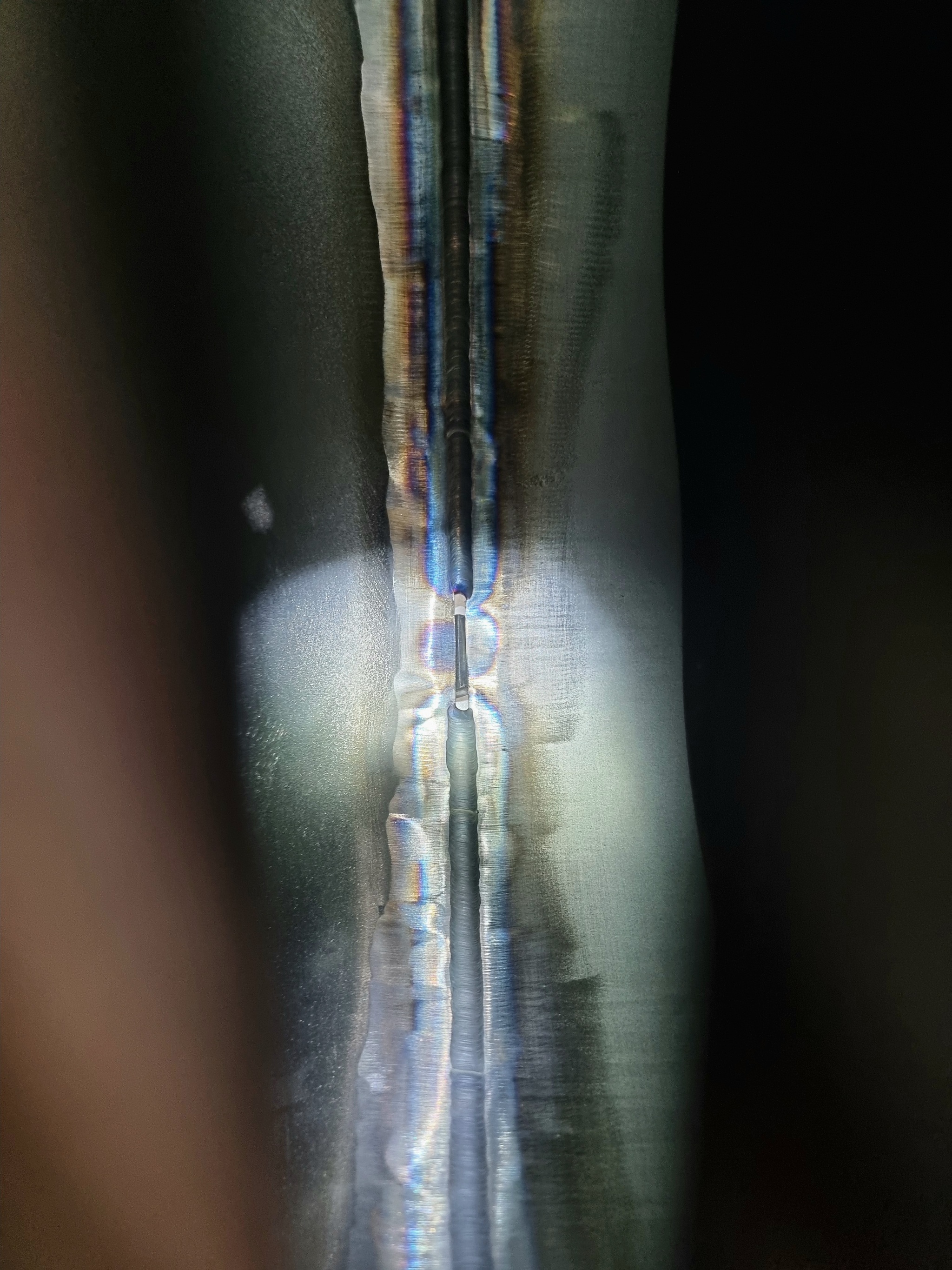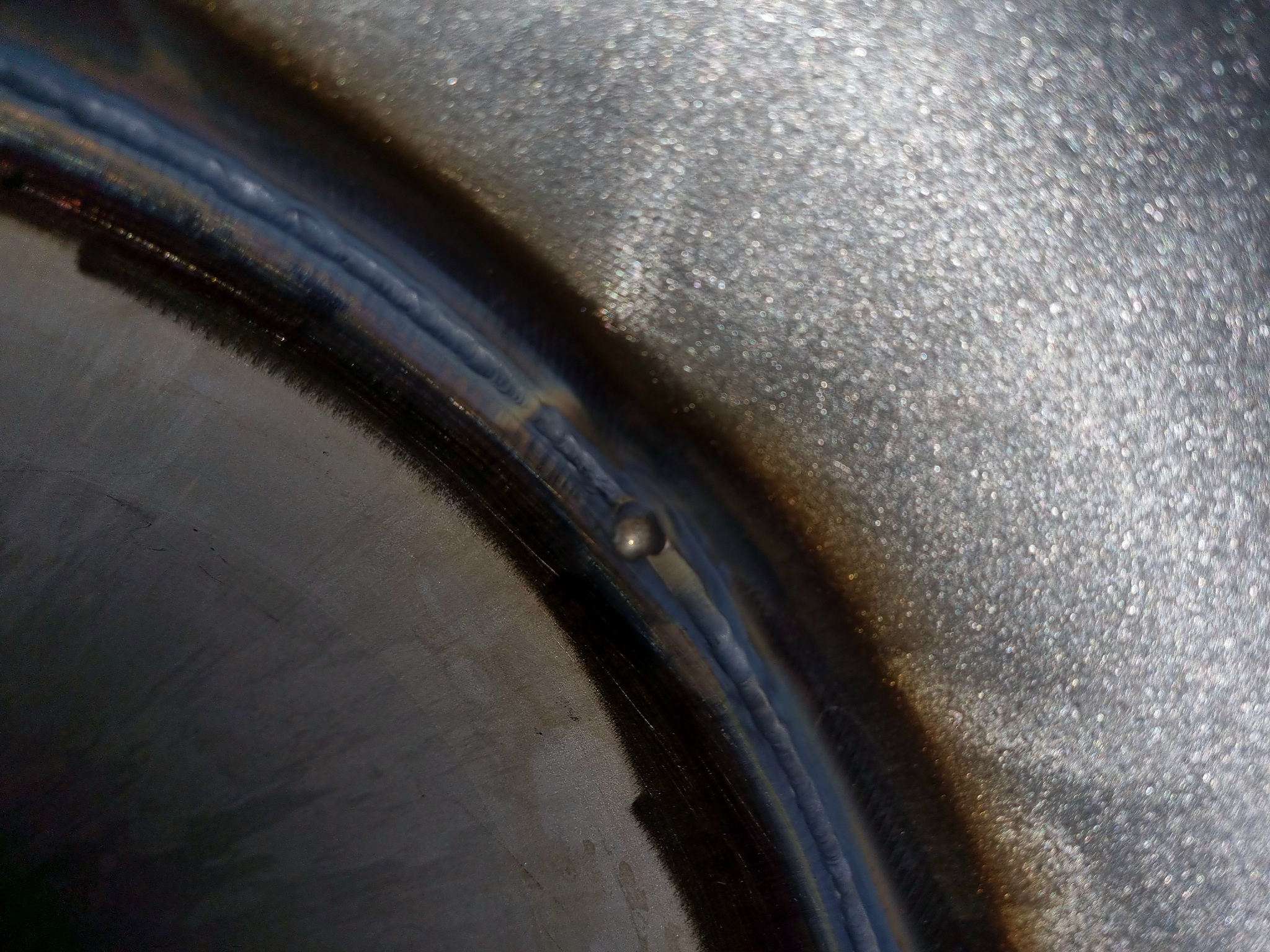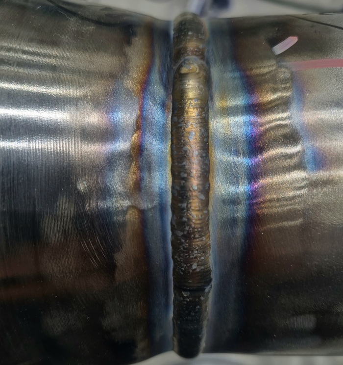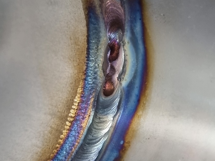 Тут кстати после последнего захода в корне из-за избытка аргона в трубе выдавился шов наружу, поэтому используем на одном конце заглушку с отверстием в 4мм для протавливания