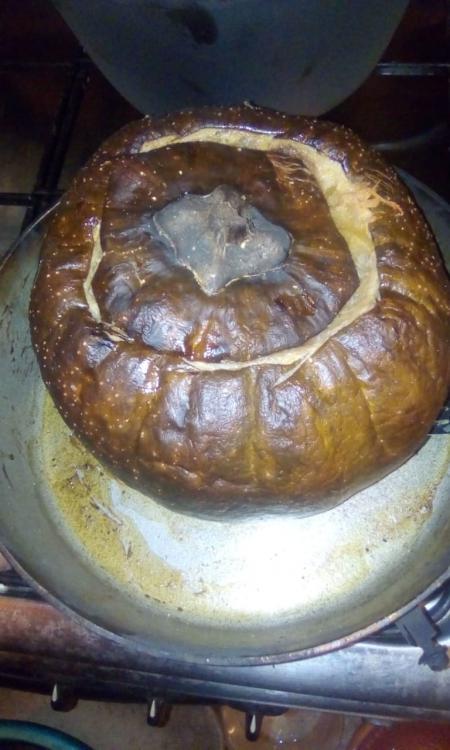 Ну и вкусняшка, тыква с мясом.Газовая плита как подставка теперь служит.
