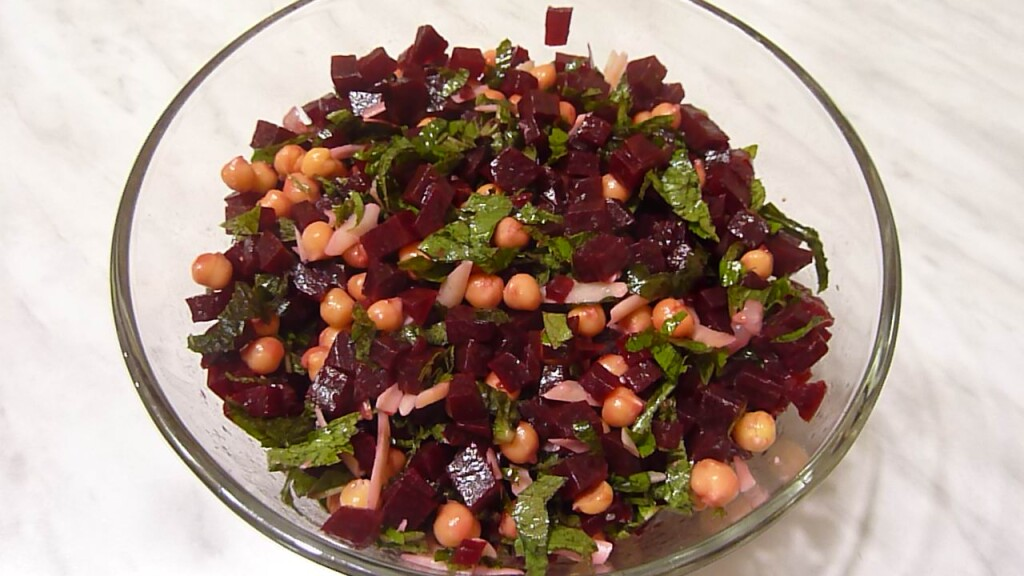 Нут для салата варится от полутора до двух часов. Предварительное он вымачивается в воде от 4 до 9 часов. . Нут и свеклу можно приготовить накануне. Для салата они должны быть остывшими.