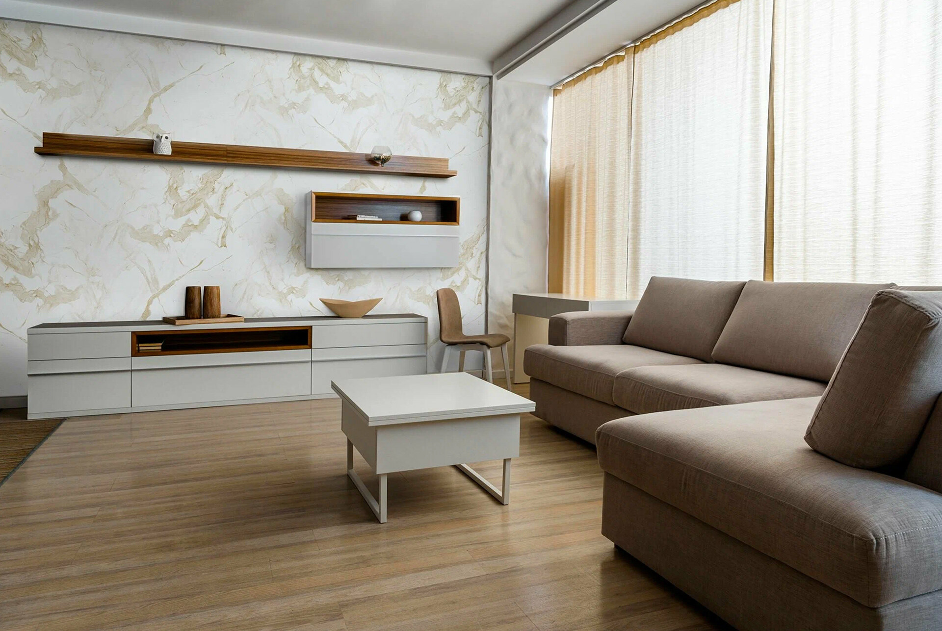 Пример интерьера со стеновыми ламинированными панелями мдф с текстурой мрамора. Панели примерно 2,5x1,2 м, недорого, быстрый(большой формат) и простой монтаж, износостойкие