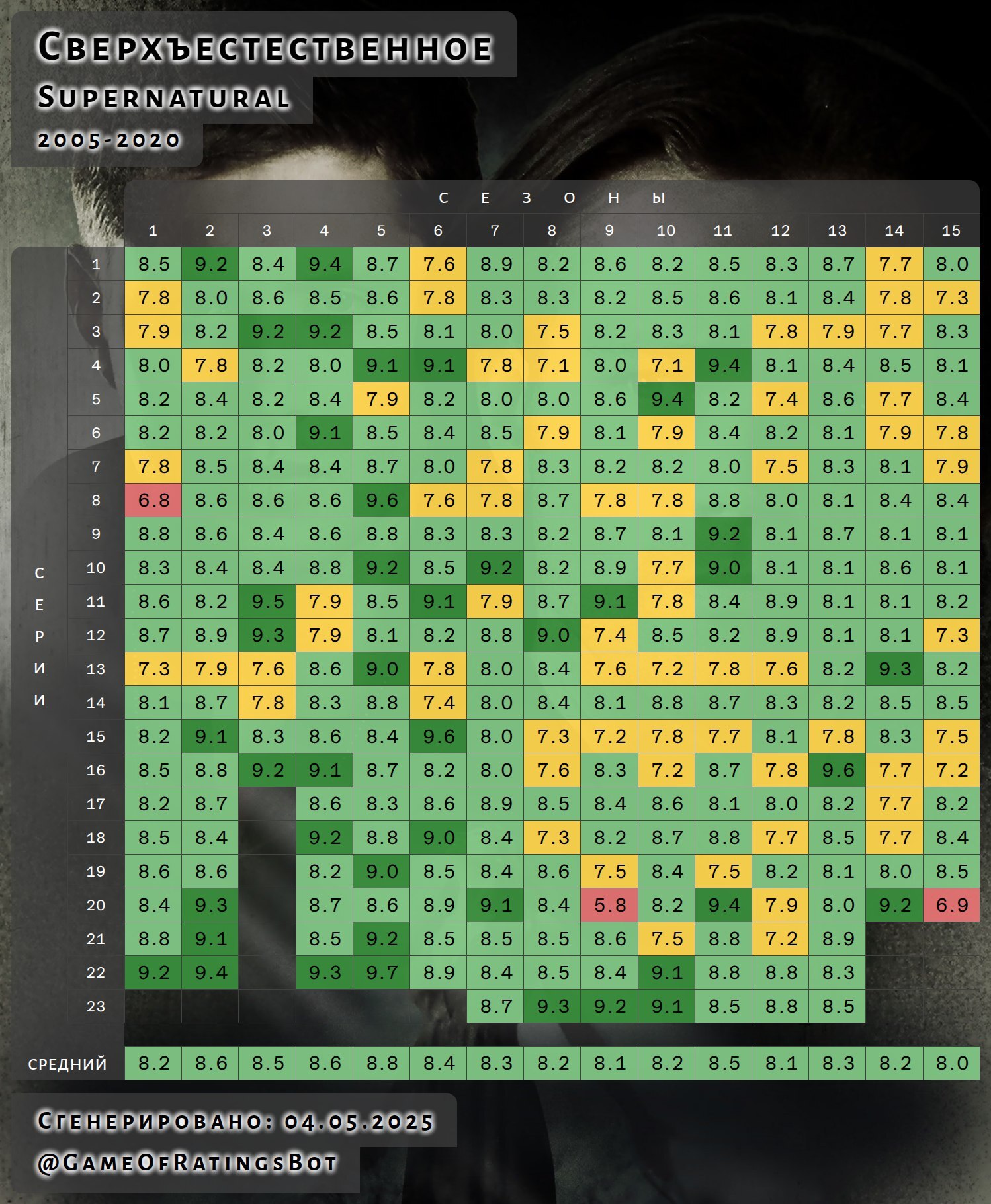 «Сверхъестественное» (Supernatural) — американский телесериал, выходивший с 2005 по 2020 год. Он рассказывает о приключениях братьев Винчестеров, Сэма и Дина, которые охотятся на сверхъестественных существ. За 15 сезонов шоу завоевало большую аудиторию и запомнилось множеством необычных и креативных эпизодов.