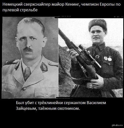 Что остается в результате? А в результате — красивая героическая история о трехдневном противостоянии двух снайперов-мастеров своего дела. Могло ли такое иметь место? Не только могло, но наверняка имело место неоднократно и не в одном Сталинграде. Вот только майора Кенига, скорее всего, не существовало. Если, конечно, немцы не потрудились убрать упоминания о нем из всех возможных документов — списков личного состава, списков награжденных и тому подобного.