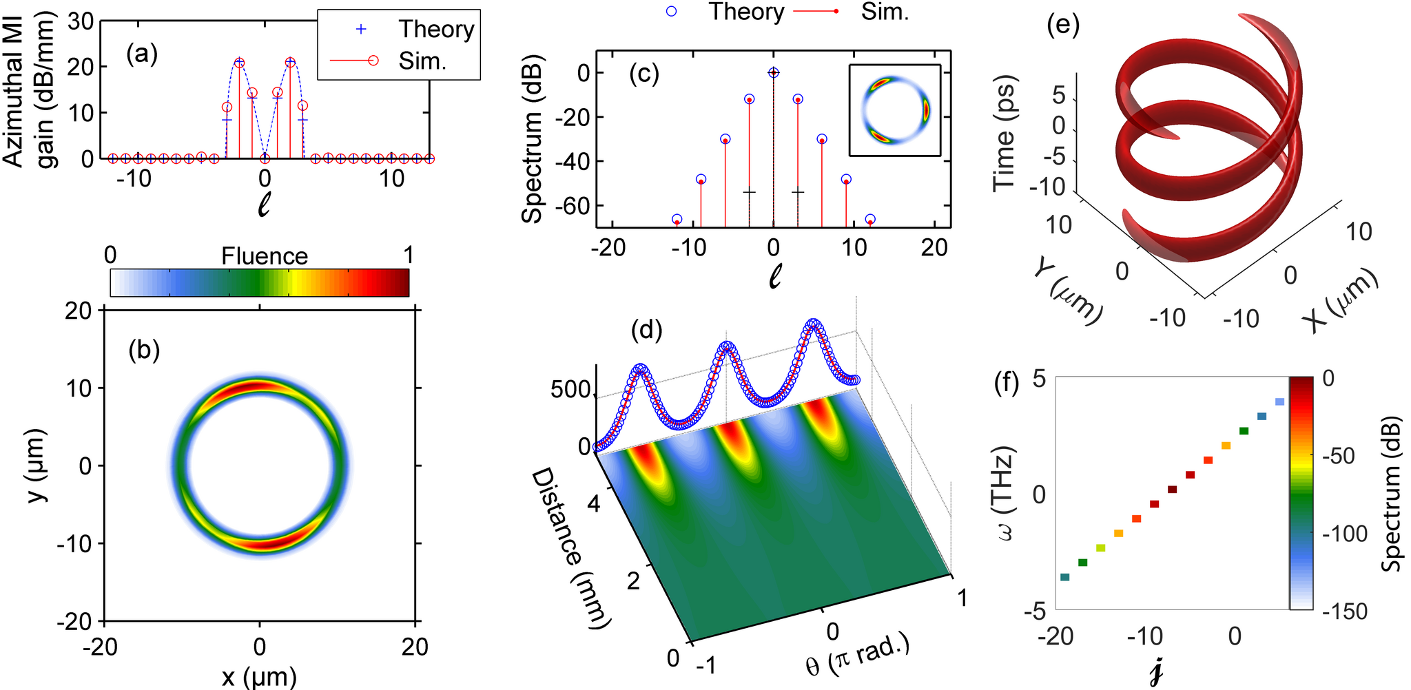 Теоретическое и численное моделирование демонстрирует спонтанное развитие азимутальной модуляции неустойчивости в кольцевых оптических волокнах, приводящее к формированию азимутальных дыхателей Ахмедиева и самомодулирующихся световых пуль с ненулевым орбитальным угловым моментом ℓ и соответствующим спектром, классифицированным по полному угловому моменту j.