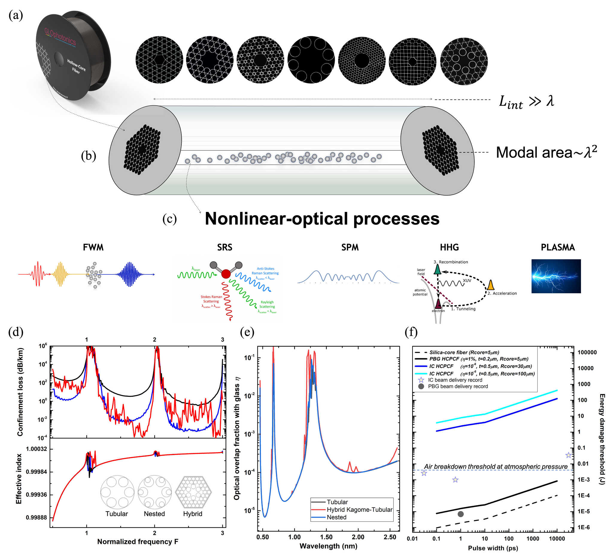 Исследования коммерчески доступных полых фотонных кристаллов (HCPCF) и иллюстрации функционализации газами демонстрируют разнообразие нелинейно-оптических процессов, а численные расчеты для трех передовых конструкций (диаметр сердцевины 34 мкм, зазор между отверстиями 4,8 мкм, толщина диэлектрика 641 нм) показывают зависимость потерь на ограничение и эффективного показателя преломления nₑff от оптического перекрытия с кремнеземом, при этом пороговое значение лазерного повреждения HCPCF зависит от механизма волновода (затухающее сопряжение или запрещенная зона), что подтверждается экспериментальными данными.