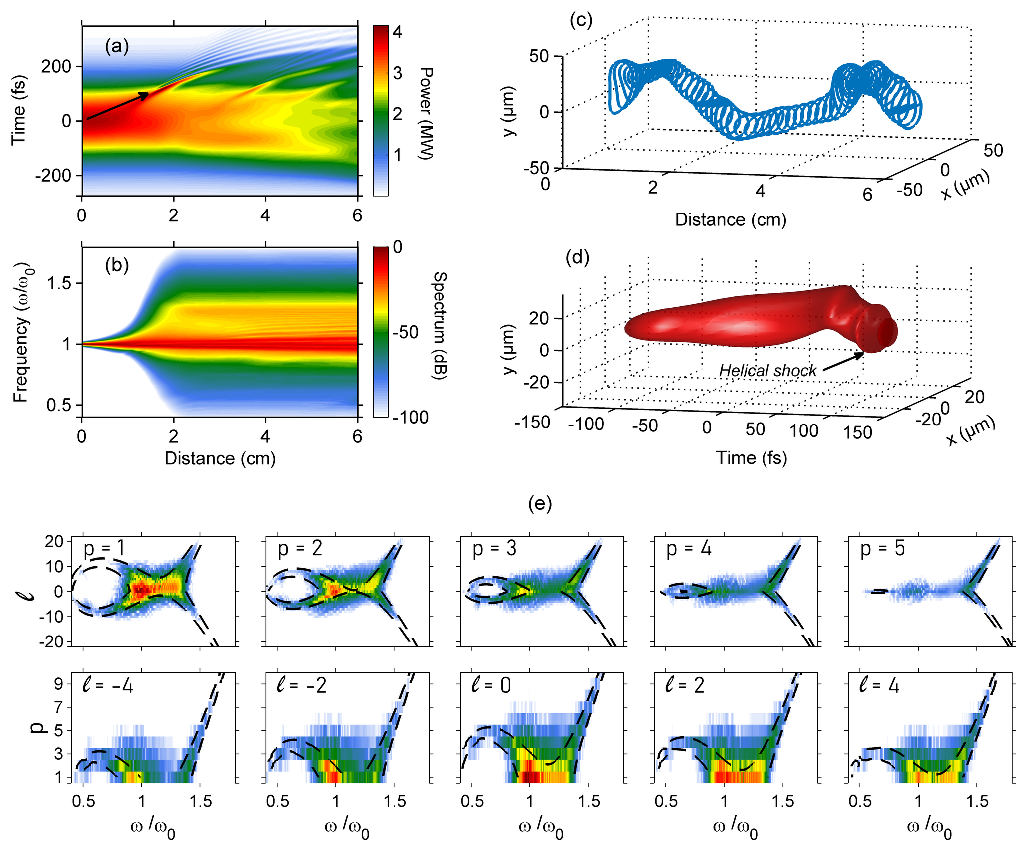 В ходе исследования нелинейного распространения 250-фс импульсов с энергией 1.05 мкДж при длине волны 1030 нм в 6-сантиметровом сегменте многомодовой оптической волоконной линии, было установлено, что формируется оптический удар, характеризующийся эволюцией мгновенной мощности и спектральной плотности, а также распространением изоконтур флюенса, что демонстрирует формирование пространственно-временного геликонного пакета, модулированного задержкой по времени δ k₁ и вращающегося вокруг оси распространения с угловой задержкой δ kℓ относительно исходного импульса, центрированного на частоте ω₀.