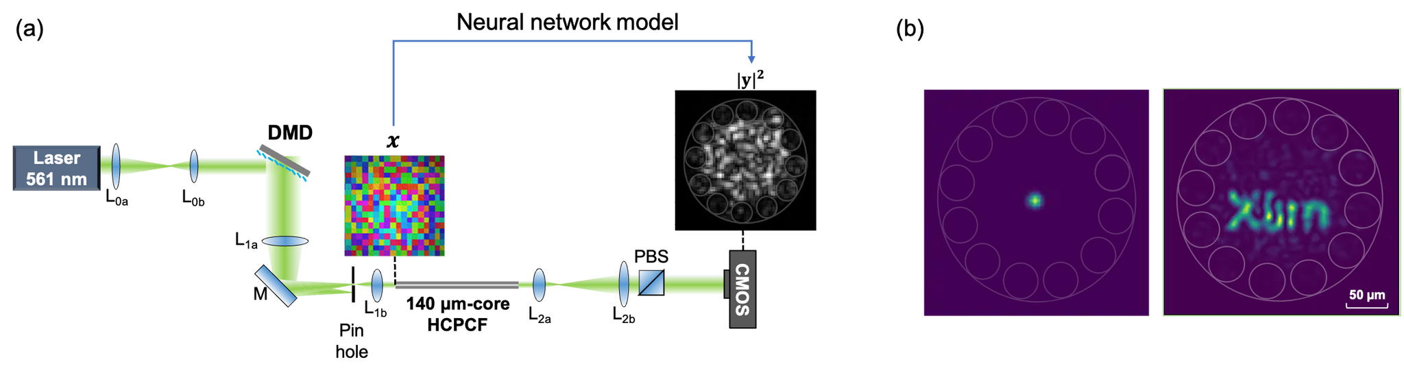 Экспериментальная установка, использующая нейронную сеть, позволила оптимизировать распределение света в сердцевине многомодового волокна 140mu m с целью формирования как сфокусированного пятна 10mu m в диаметре, так и проекции логотипа Xlim (данные из [Gerome41]).