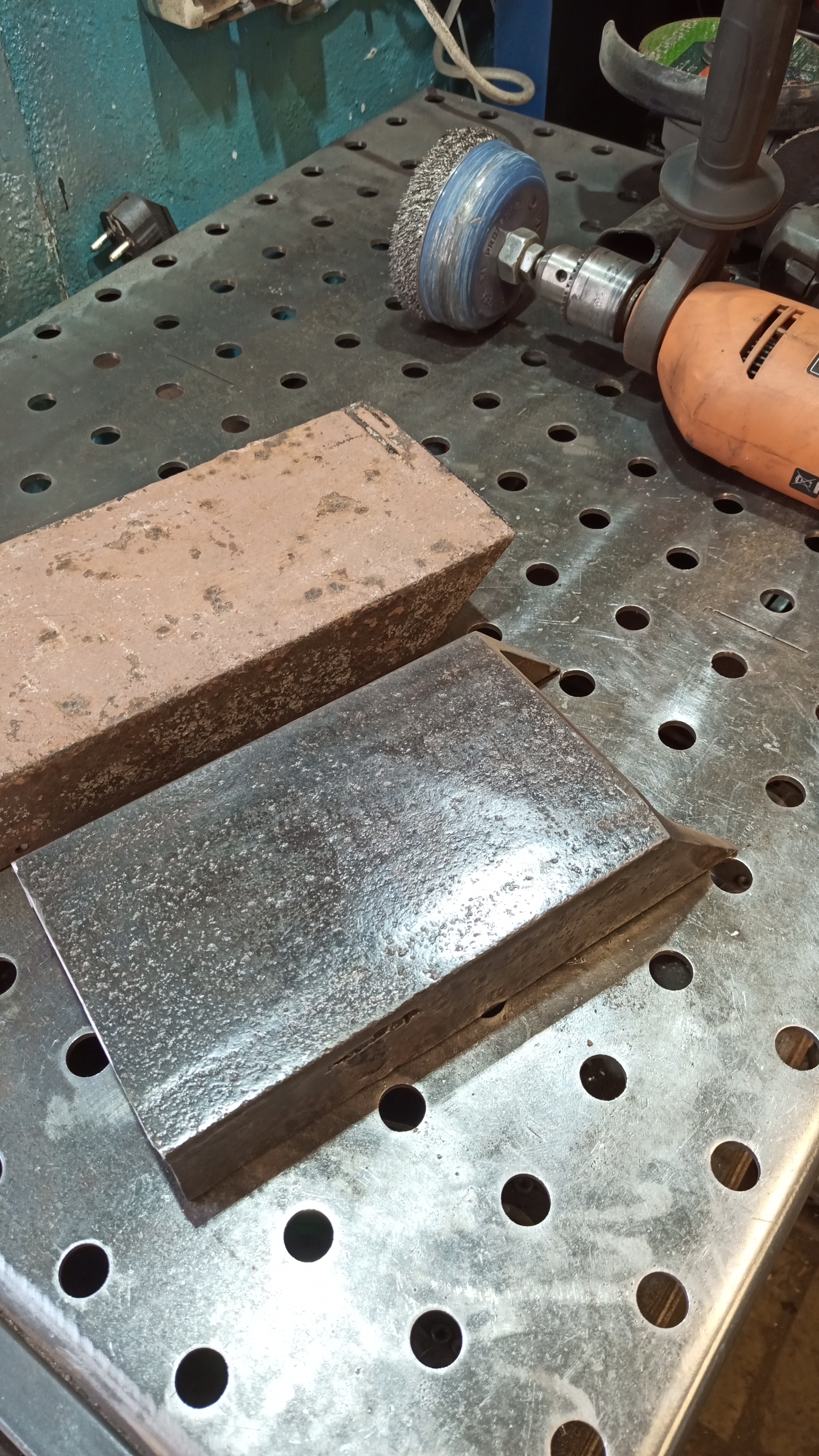 Как оказалось после зачистки, металл далёк от состояния "ко́панки", так как не был закопан в землю, а большей частью лежал на открытом воздухе. Коррозия за 20+ лет придала поверхностям металла интересную фактуру, хаотично расположенные ямки и раковины, трещинки.