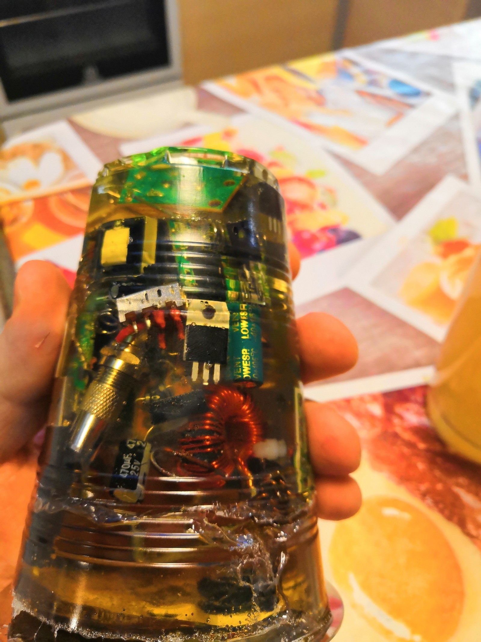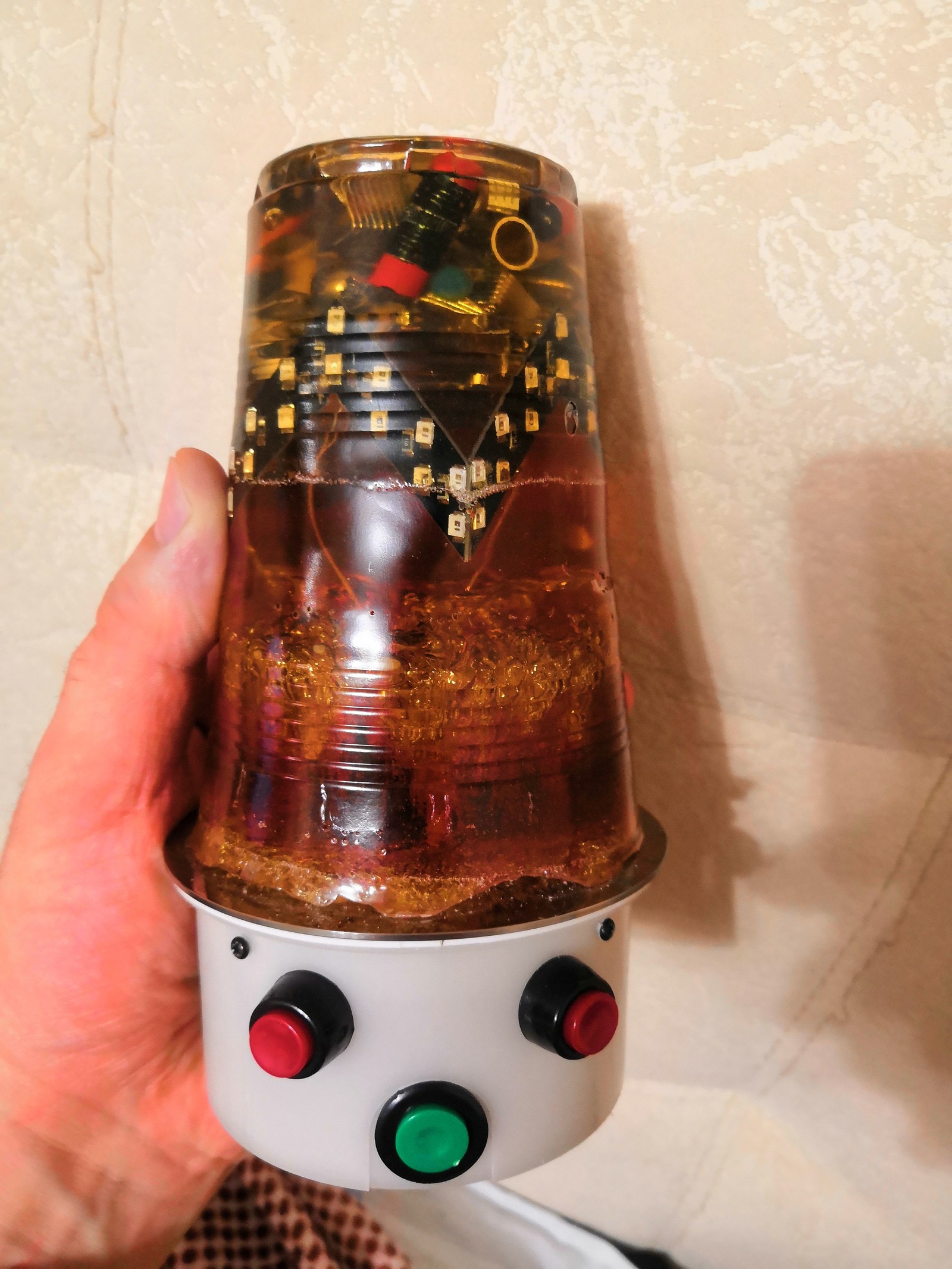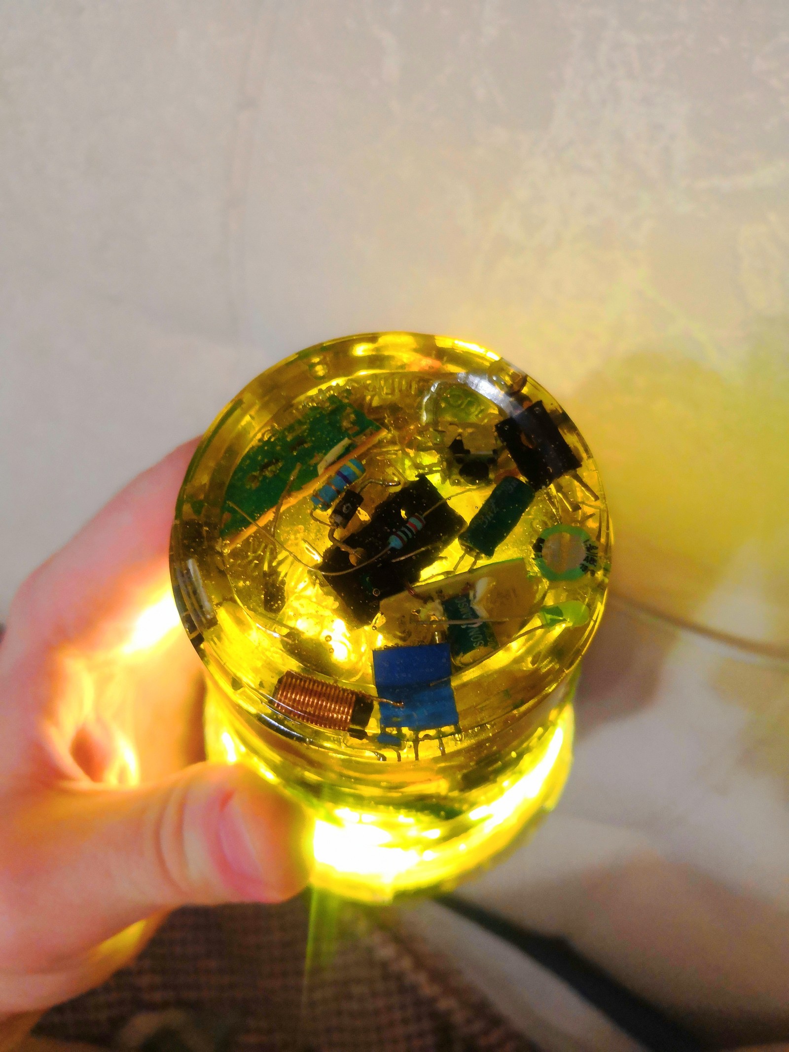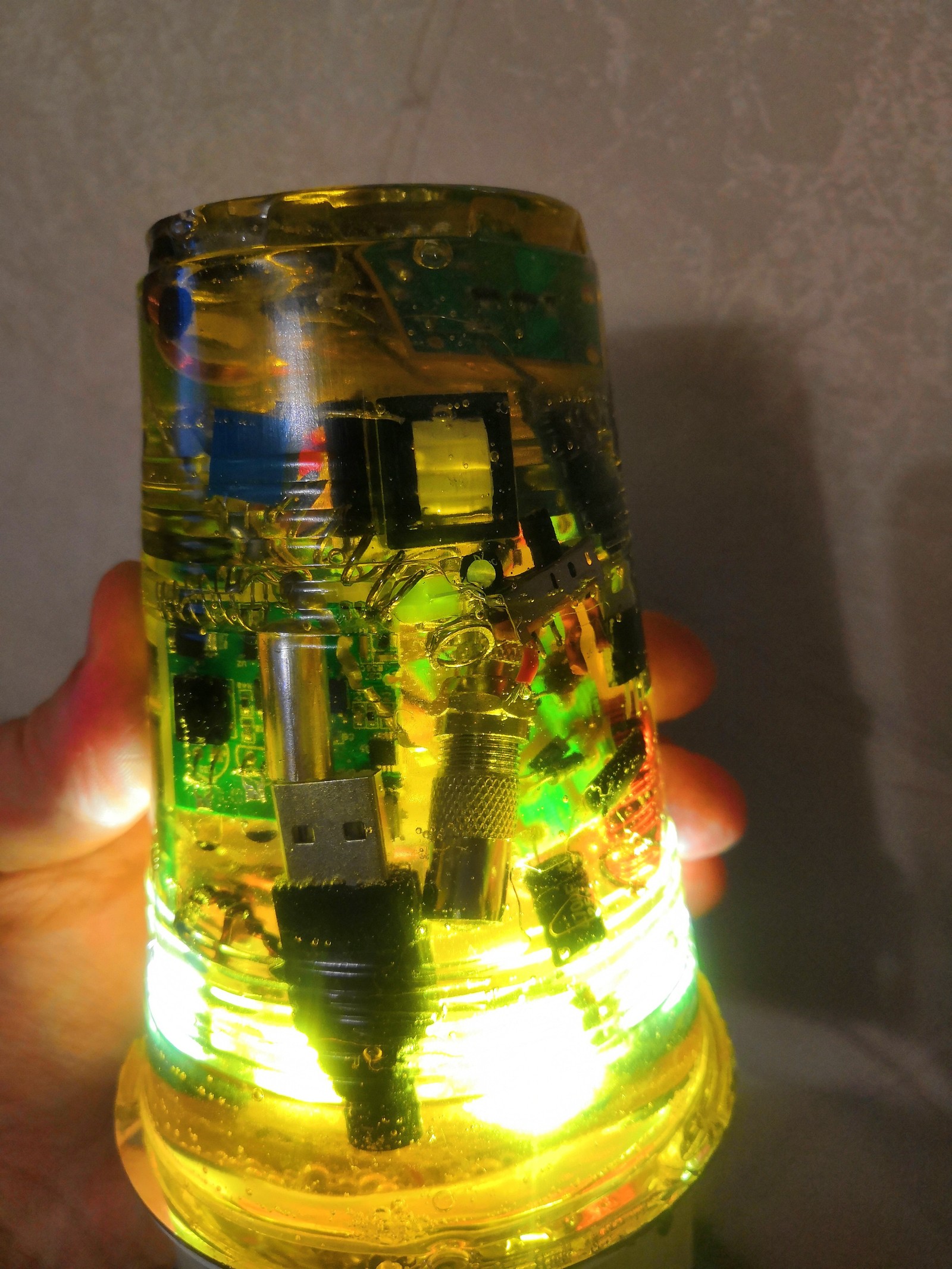 Насмотревшись ютуба я решил запилить ночник для своих детей. Поискав в магазинах города прозрачную эпоксидную смолу и потерпев в этом деле облом, решил действовать своими силами и имеющимся материалом. Купив пива и пивных стаканов взялся за дело. Из имеющего материала было куча мелкого электронного мусора, мелкий метиз, паяльник, прямые руки, китайские радиозапчасти, и фантазия подогреваемая пивом)))