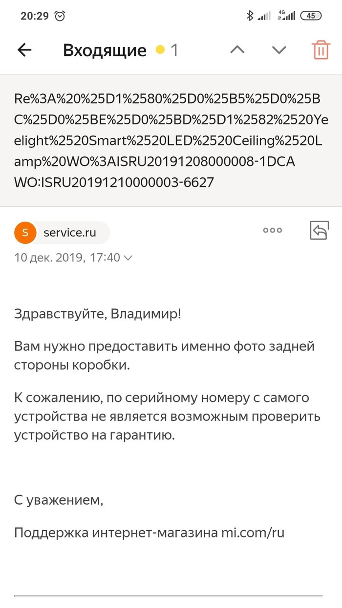 Следом я написал на официальный сайт mi.com/ru. Эта часть меня поразила сильнее всего. Я попросил дать контакты сервисного центра для ремонта светильника. Мне ответили, чтобы я прислал фото обратной стороны коробки, чтобы определить попадаю ли я под гарантию. Я прислал фото серийного номера светильника, но мне повторили, что нужно фото коробки.