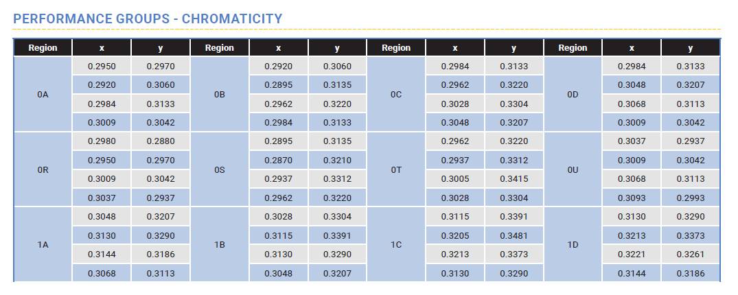 Как видим - все это разбито на группы при сортировке, так как невозможно в одной партии абсолютно точно повторить параметры, с точки зрения физики и химии при производстве. И если кто то вдруг утверждает, что все светодиоды в условно 100 светильниках абсолютно одинаковы, то знайте - он лукавит (возможно по незнанию). Можно взять координаты цветности и поставить точку на цветной области, тем самым понять что за цвет получается.