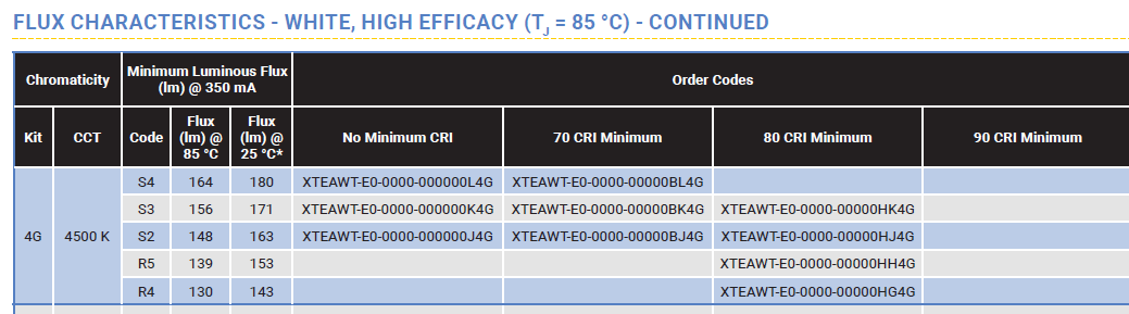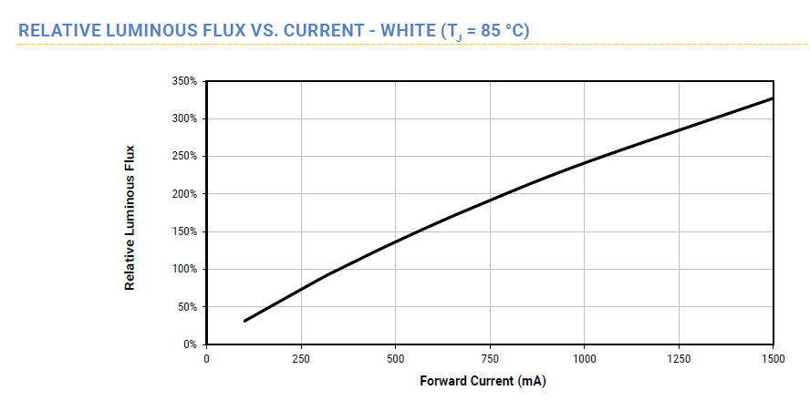 Там же наверху указывается, минимальное значение светового потока (Lm), при каком токе (@350mA) его получили и при какой температуре кристалла (горячий (85) или холодный (25)). Собственно берем световой поток на стандартном токе, например 180Lm и знаем что это 350мА и идем на график выше. Например при 750мА точка пересечения кривой будет примерно на уровне 185%. Взяли 180Lm, умножили на 1,85 (185 процентов) и получили 333Lm. По нашему будет 333Лм)).