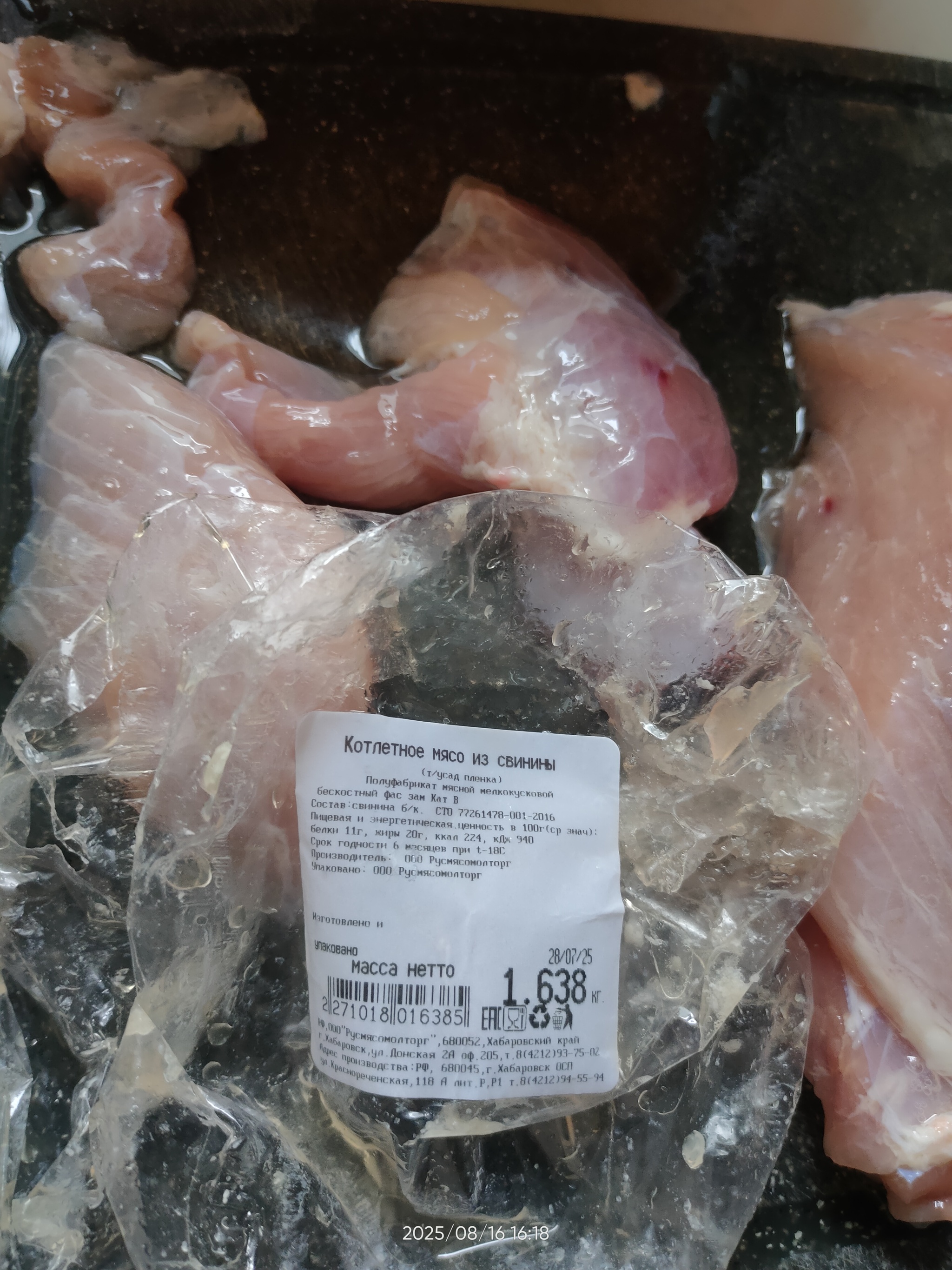 Ни когда не покупал там что то из еды,но вот сподобился...бабушка- покупатель ввела в заблуждение,попросила прочитать ценник- наклейку. Смотрю, так красиво выглядит ну и тоже взял. Встречайте. Свинина без кости в брикетах под названием "Котлетное мясо" из Хабаровска