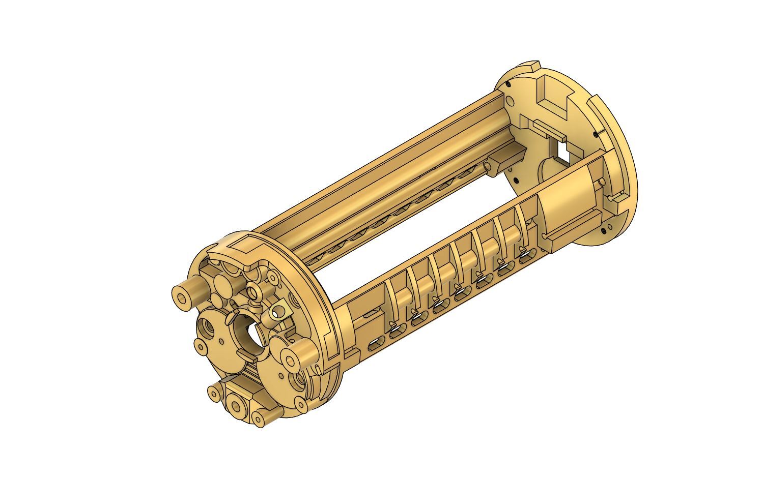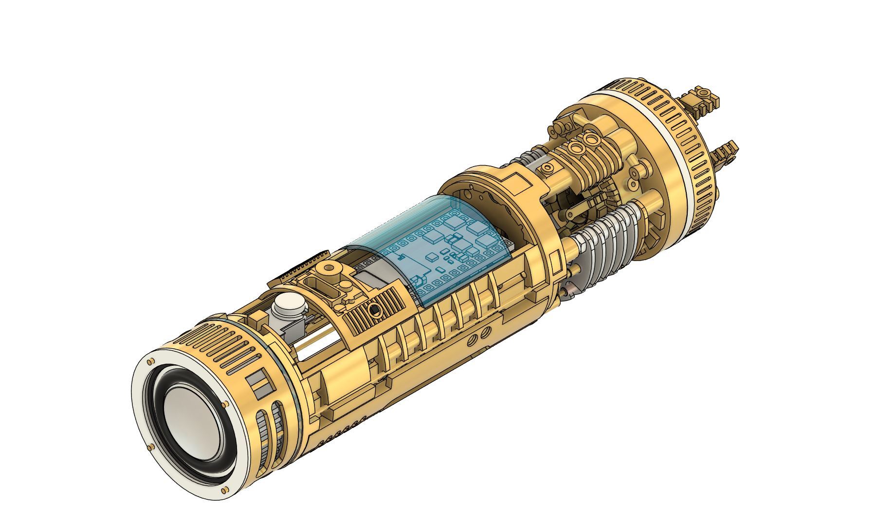 На сегодня замоделил около 70% конструкции. На изображении ниже самая сложная часть. Она содержит аккумулятор 18650, плату управления, модуль зарядки аккумулятора, выключатель, слайдеры переключения режимов работы и акустических эффектов.