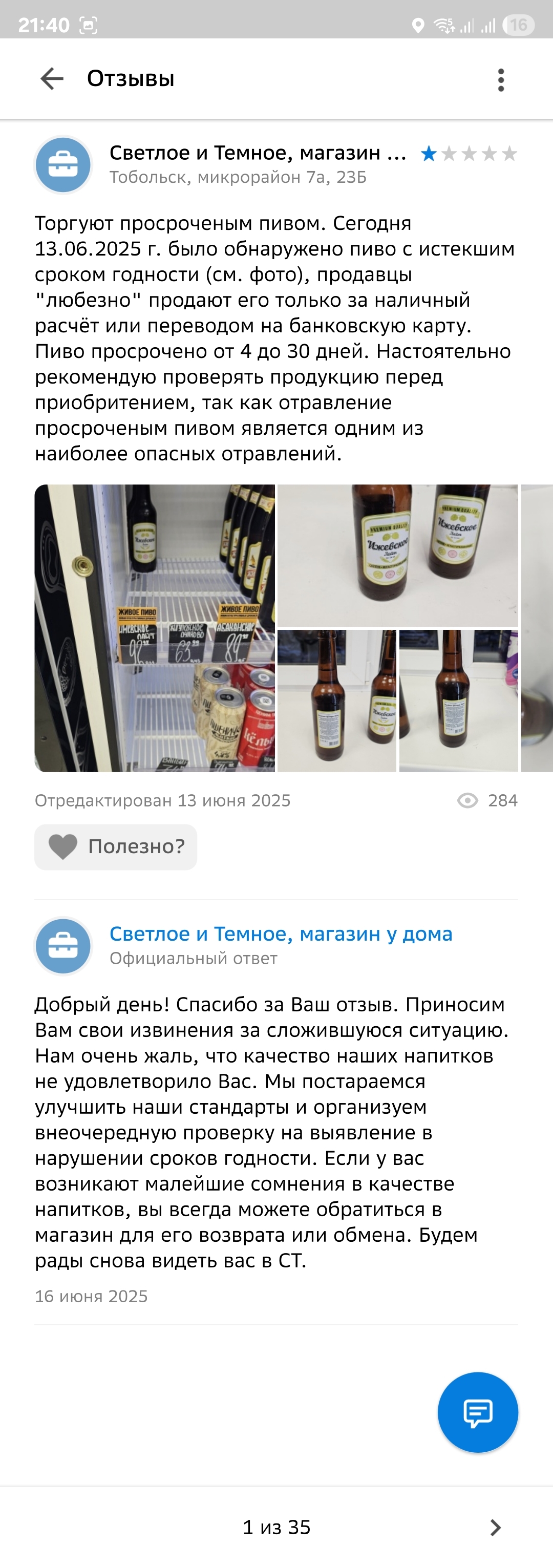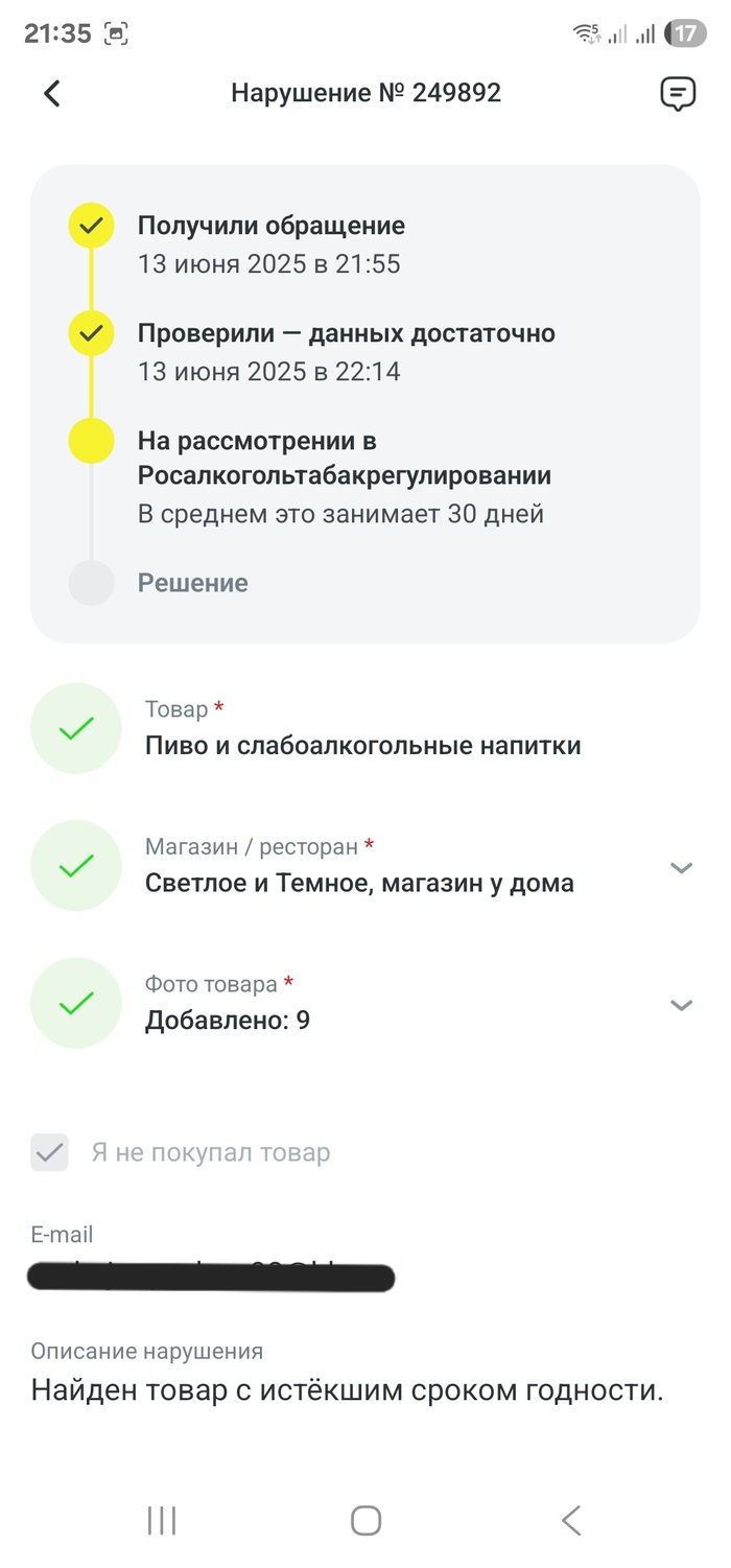 И вот спустя почти две недели, я снова зашёл в этот "замечательный" магазин в надежде попробовать свежего Ижевского пива. Но в очередной раз знатно ОХУЕЛ был удивлён, когда обнаружил в холодильнике тоже самое просроченое пиво. В этот раз решил действовать более настойчиво и на каждую бытулку с истекшим сроком годности оставлять отдельную жалобу в приложении честный знак. Но хуй там плавал, из пяти обращений принято только одно, остальные отклонены с формулировкой: "Не подтвердилось. К сожалению, ваша заявка была отклонена ведомством. Спасибо, что были неравнодушны. Попробуйте снова, когда найдете нарушения".