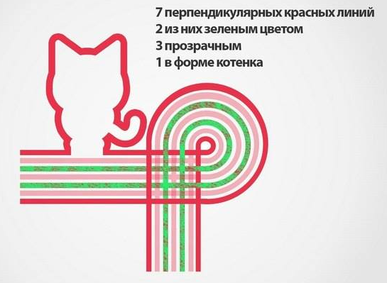 Чуть позже, сейчас я рисую семь перпендикулярных, красных, прозрачных линий, одна из которых зелёная, а другая в виде котёнка.