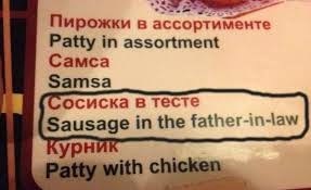 А теперь дословный перевод обратно: "Sausage in the father-in-law". Сосиски в тесте. В тесте от слова "тесть".