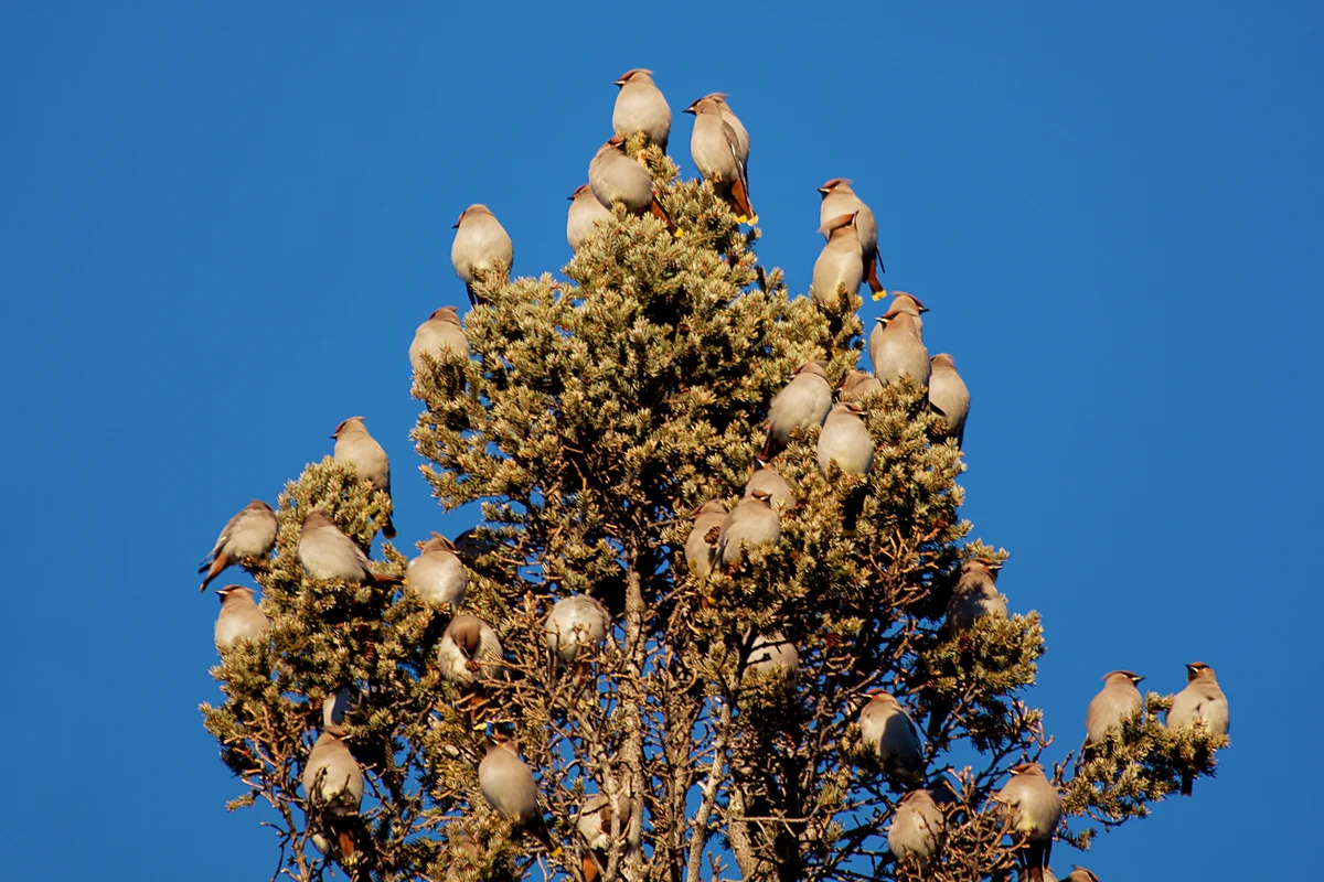 Свиристели любят компанию. Стайный инстинкт развит настолько, что пернатые не могут жить друг без друга. Они общаются вне зависимости от занятости. Песня свиристелей мелодичная и очень громкая, а в стае она многократно усиливается. В результате дерево, на котором сидит птичья стайка, кажется живым. Но если свиристель окажется оторванной от семьи, то вполне может «уйти в закат» от недостатка общения.