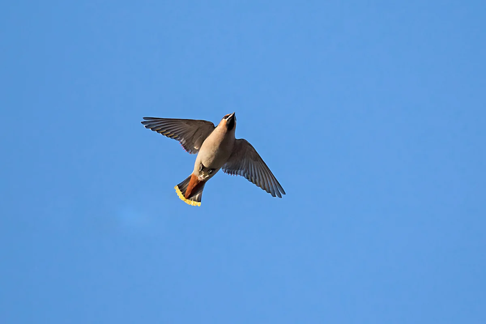 Помните песню Водяного из «Летучего корабля»? Так вот, свиристель — прямая противоположность персонажу. Её полёт быстрый и лёгкий, но крылья «барышня» использует исключительно как рабочую силу. Это всё равно, как если бы владелец «бентли» пошёл в таксисты. Когда погода располагает, свиристель поднимется высоко в небо. Чуток полетает ради удовольствия и вниз — за провизией. Не ценит свои возможности.