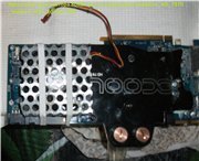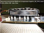 На радиаторе блока питания видеокарты закрепил с помощью бельевых резинок и куска решетки воздушного фильтра вентилятор 80х80 мм с 3 х пиновым разъемом.