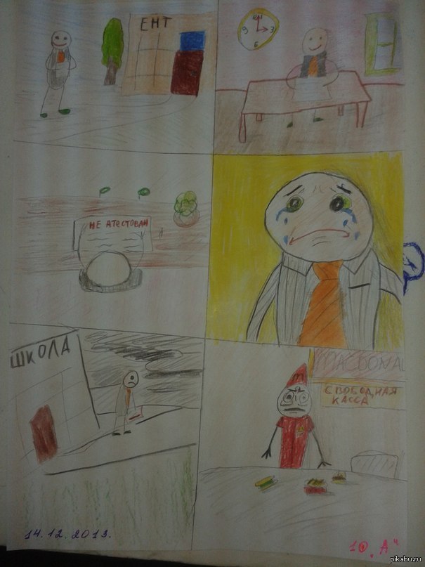 10 luckyone 11 лет назад Свободная касса В декабре, на уроке самопознания учитель попросил нас нарисовать как мы видим сдачу и само ЕНТ. Я нарисовала это. [моё] ЕНТ Урок Школа
