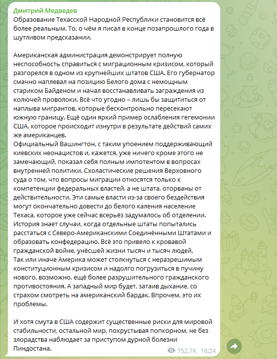 Естественно, центральной власти в лице Байдена и ко. - это не понравилось, и они потребовали в течение 24 часов вернуть контроль над границей в руки федералов. Но были посланы.