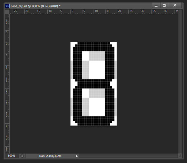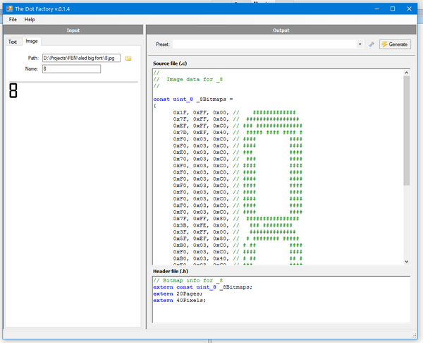 Сохраняю в картинку каждый символ, перегоняю его в хекс с помощью DotFactory (скрин наспех, делал уже потом, для данного поста, восьмёрка кривая, как видно по визуализатору, не исправлял настройки программы):