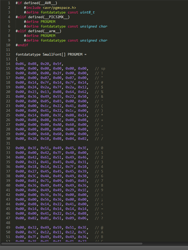 Вставляю в файл шрифта, в скопированный блок с новообозванным шрифтом. Затем загружаю в ардуино тестовый скетч и получаю сраку на дисплее (фото не делал, там просто россыпь хаотичных пикселей, как будто гном чихнул).