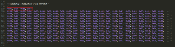 В общем ни один из стандартных шрифтов мне не подходил категорически. Ну чтож, подумал я, значит надо сделать свой шрифт с блекджеком и шлюхами. Дело за малым – найти гайд и бабахнуть. Но тут всплыла ещё одна проблема – гайдов по этому делу нет, только ссылки на мёртвые сайты, хождения вокруг да около, троллинг, закольцованные комментарии. Ныть на форумах я не собирался, ожидая что кто-то сделает всю работу за меня, поэтому принял решение расковырять библиотеку, а конкретнее файл DefaultFonts.c, лежащий в её папке. Итак, открываем его и видим портянку из шестнадцатеричного кода с комментами.