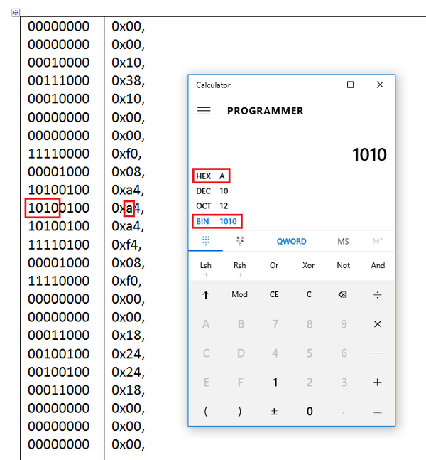 После того, как все значения записаны в двоичном коде - переводим их в шестнадцатиричную систему счисления, я делаю это с помощью калькулятора из 10ой винды, можно приспособить любой онлайн конвертер или прогу BinDecHex. В принципе наверное можно забить в файл шрифтов и в двоичном коде, но я не пробовал, можете попробовать и отписаться. В двоичном формате наверняка портянка получится дай боже.