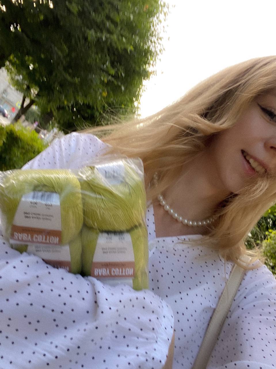 А если удариться немного в подробности, то у меня сохранилось немного процесса. Вот, купила 10 моточков пряжи Yarn Art "Baby cotton". Поделилась задумкой изделия с продавщицей, она сказала получится тяжело и идея не очень. Но моё чутьё подсказывало иное и я связала.