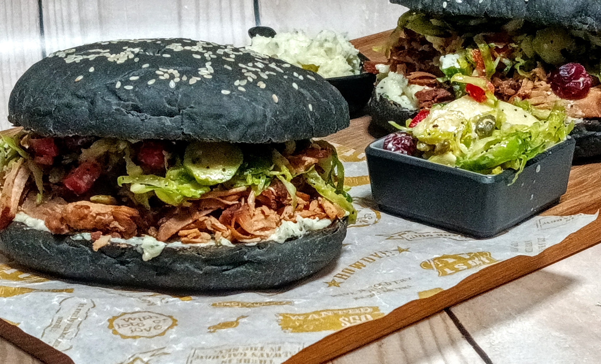 Вкуснейшая, немного терпкая и в то же время сладкая и пряная рваная свинина на мягких гавайских булочках с восхитительным салатом из яблок, клюквы и брюссельской капусты и спредом из сыра бри.