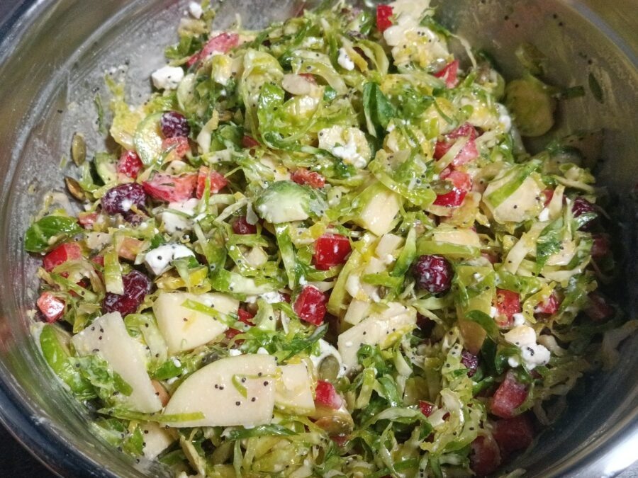 Нарежьте очень тонко брюссельскую капусту, яблоко и перец ломтиками. Раскрошите фету и сложите все ингредиенты в миску. Смешайте все ингредиенты для заправки и вылейте на салат. Уберите в холодильник на несколько часов.