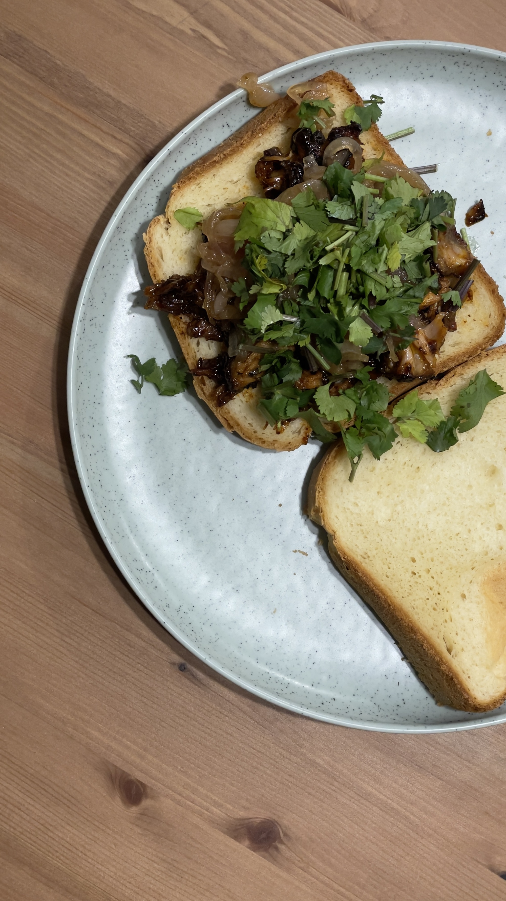 Хлеб можно обжарить с одной стороны на сливочном масле. Достаем ребрышки, рвем их, накидываем на хлеб, сверху выкладываем лучок и кинзу, накрываем вторым куском хлеба. Ваши вкуснейшие сэндвичи готовы, а вы прекрасны! Приятного аппетита!