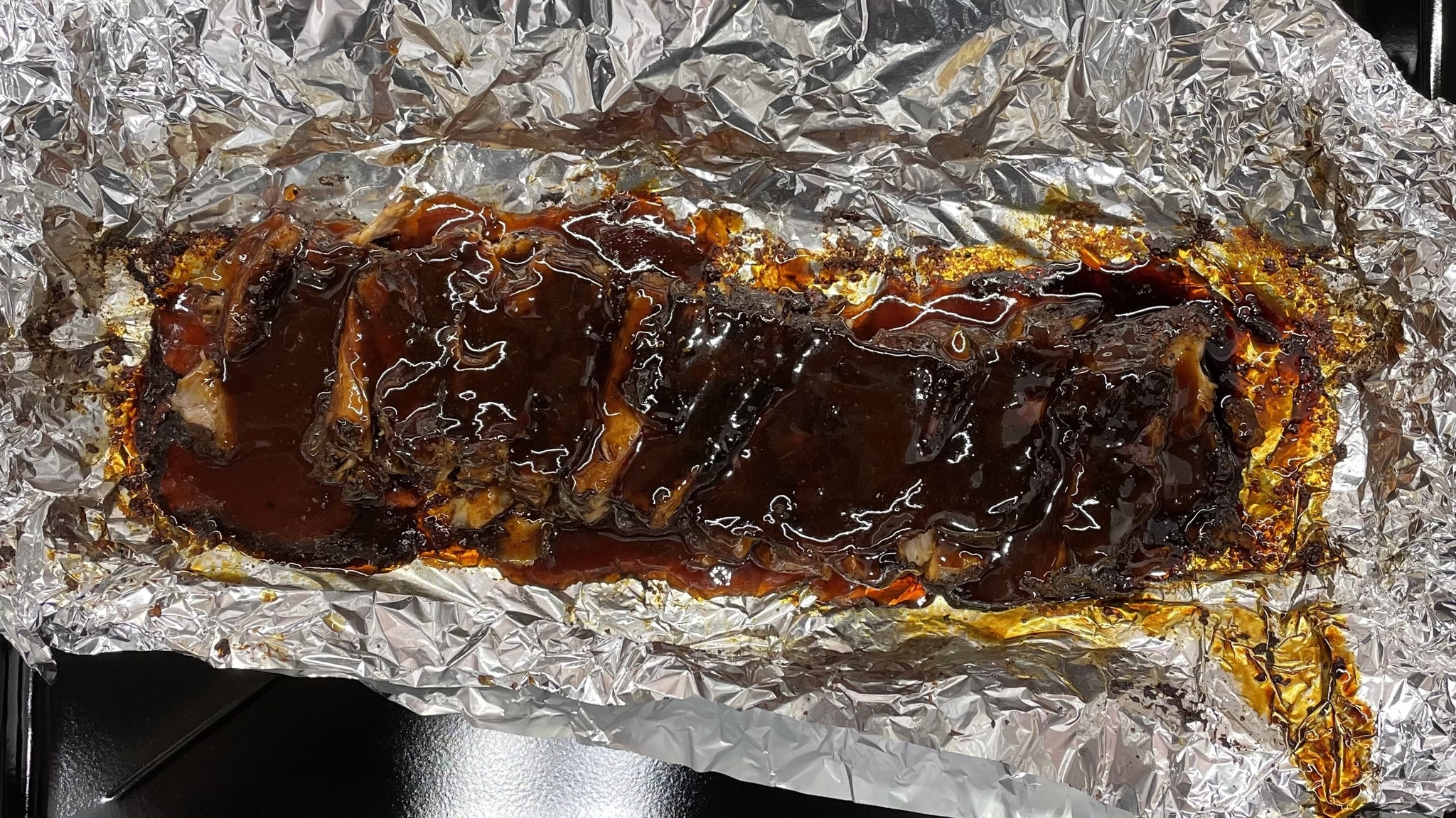Смешиваем все ингредиенты обсыпки, выкладываем ребра на фольгу на противень, щедро обмазываем их и закрываем фольгу. Отправляем в духовку на 150 градусов на 3 часа.